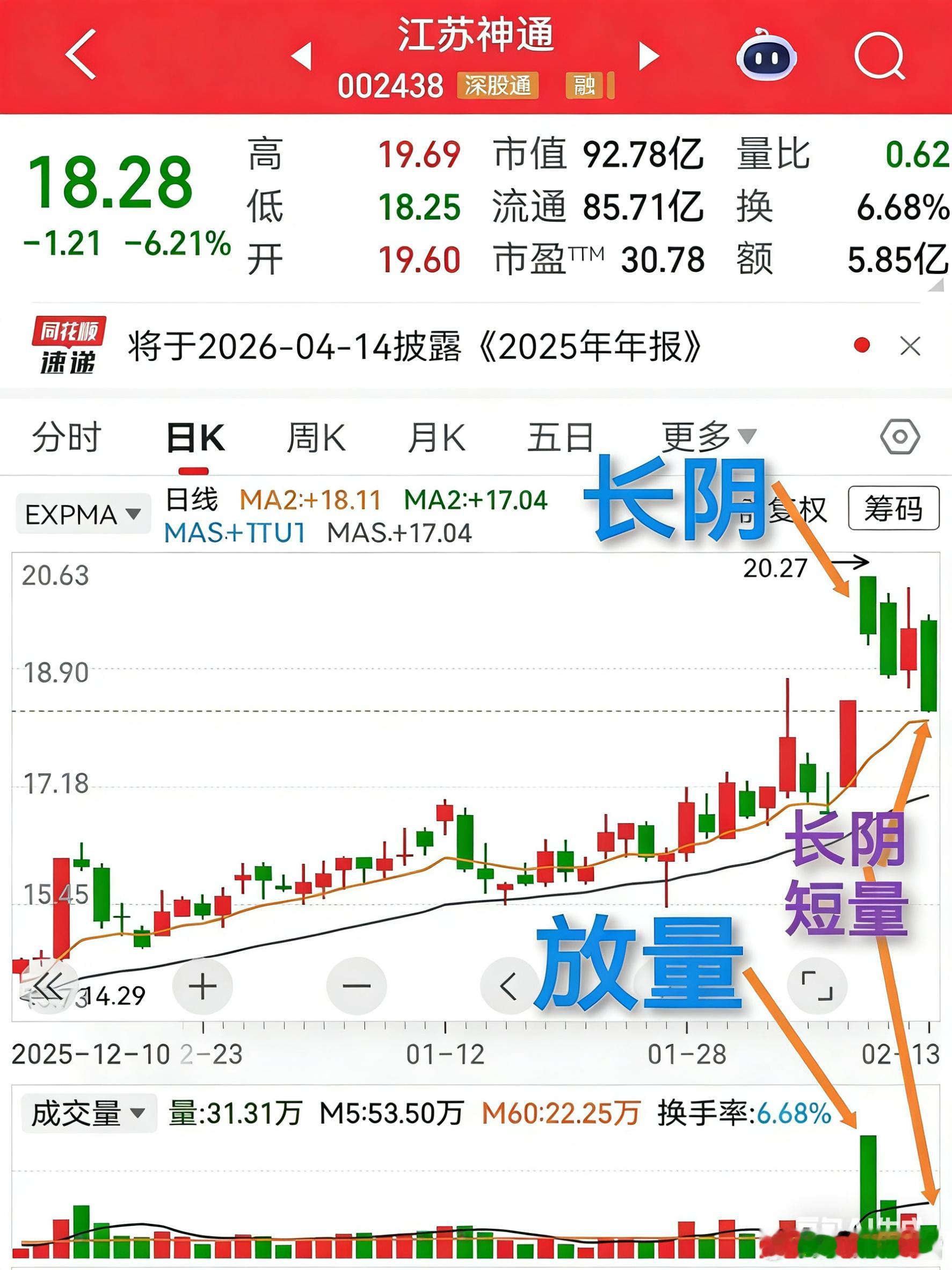江苏神通名字大气,走势更有细节:前期涨停后出过数倍量假阴真阳,年前最后一天再收大阴线,却是明显缩量,抛压在收敛。