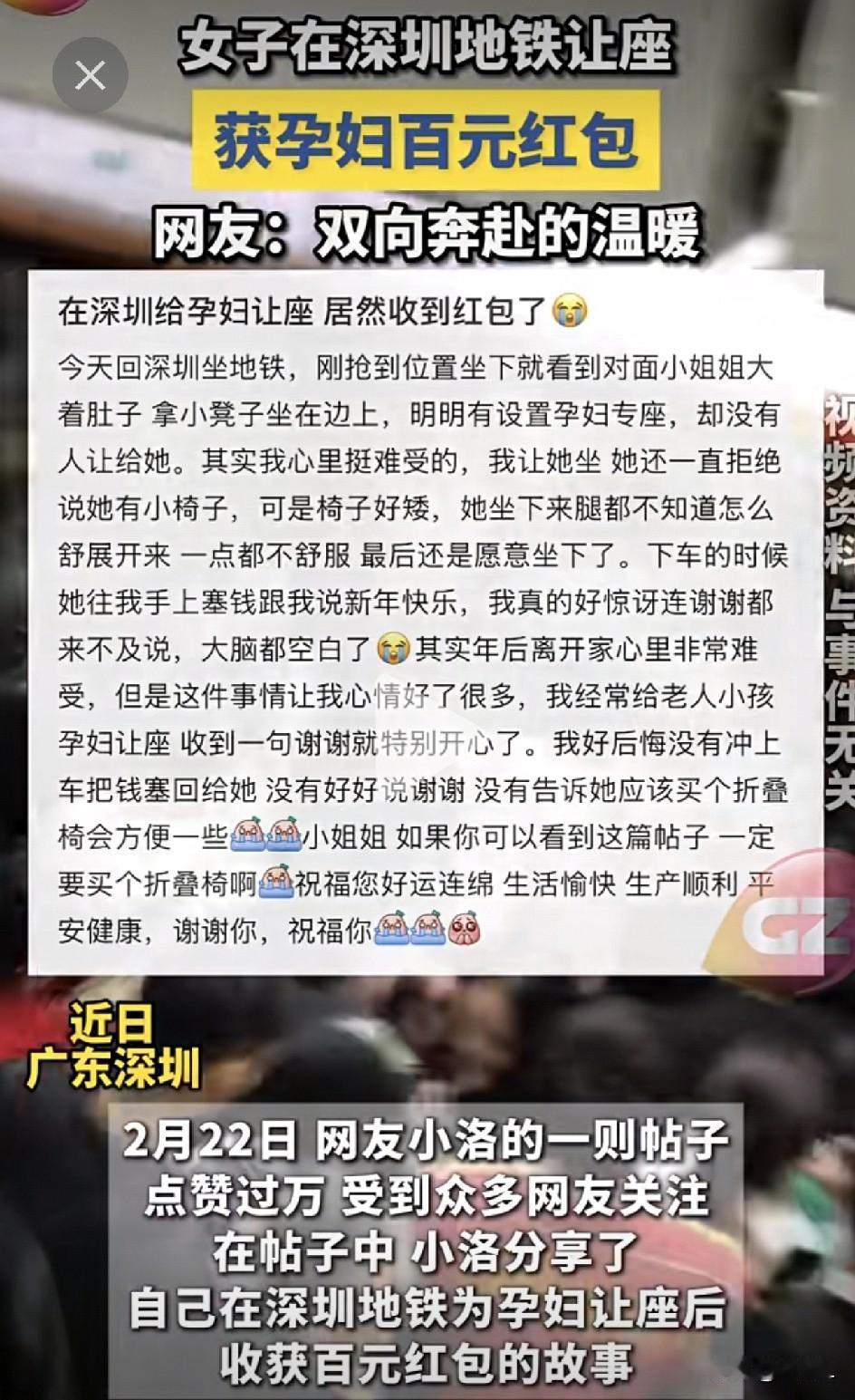 爆火!深圳姑娘地铁让座,孕妇偷偷塞100元红包!姑娘全网急寻:换成折叠椅会舒服很多! 深圳地铁这一幕,暖哭全网! 2月21号晚上7点,网友小洛在深圳地铁5号线布吉站上车,刚坐下就看见一位穿灰色裙子的孕妇,没座位,坐在自己随身携带的一个小小的黄色矮凳子上。 明明车上就有孕妇专座,可愣是没人主动让座。小洛看着特别心疼,那个凳子又矮又小,孕妇坐着腿都伸不开,看着就难受。 她立马起身让座,孕妇还一直摆手拒绝,说自己有凳子不用麻烦。小洛实在看不下去,坚持让她坐下,孕妇这才不好意思地接受了。 本来就是一件随手做的好事,结果万万没想到! 快到小洛下车的时候,这位孕妇突然拉住她,悄悄塞了一个红包,打开一看——整整100块!还笑着跟她说新年快乐。 小洛当时直接愣住了,惊讶得一句话都说不出来,等反应过来,地铁门已经关上了。 事后她越想越后悔,后悔没当场把钱还给对方,这只是一件小事,根本不该收钱。 现在小洛的帖子点赞过万,彻底火遍全网,可她还没找到这位准妈妈。 她着急寻人,不只是想把100块钱还回去,更是想提醒孕妈:那个小矮凳坐着太累了,换成折叠椅会舒服很多! 同时也真心祝福她:生产顺利,平平安安,一切都好! 评论区里很多孕妇留言说,自己坐地铁、公交经常没人让座。小洛也呼吁大家:出门在外多一点善意,多照顾一下身边的孕妇和老人。 一个暖心让座,一个真诚感谢,变成了深圳最动人的风景! 刻在骨子里的善良,总能在不经意之间给别人带来温暖,无论是施于援手的人还是被帮助的人。 双向奔赴的温暖,是这个世界难能可贵的品质,在一点一滴的温暖着这个到处讲利益的社会! 素材来源:广州广播电视台,侵联删!