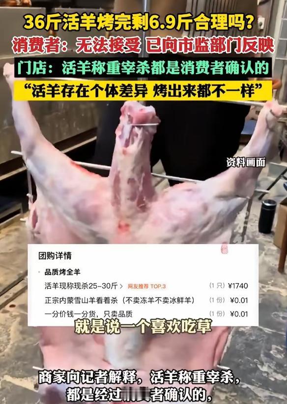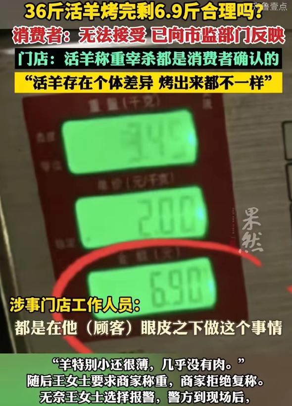 “这就太过分了!”重庆,女子一家人除夕夜没有在家做饭,而是到饭店花1188元点了一个烤全羊套餐,没成想,36斤的活羊烤完后就剩下6.9斤,女子当场报警,可店家却说:这是正常的! 过年嘛,一家人图个省心,不想在家做饭太正常了,重庆的王女士就是这么想的,2026年除夕夜,她带着全家八口人,特意去了南滨路一家烤全羊店吃年夜饭。 她花了1188元点了个烤全羊套餐,本以为能热热闹闹吃一顿,没成想最后闹得当场报警,好好的年都没过安生。 王女士选这家店,就是冲着店家“活羊现杀、现场称重”的承诺去的。 点单的时候,店家当场把一只活羊赶上秤,显示36斤,王女士看得明明白白,还特意用记号笔在羊腿上做了标记,拍了照片留作证据,就怕后续出问题。 那会儿她还挺放心,觉得店家做事透明,一家人满心期待着烤全羊上桌。 大概烤了一个小时,服务员把烤全羊端了上来,王女士一眼就觉得不对劲,这羊看着又小又瘦,几乎没什么可食用的肉,羊腿细得跟鸭腿似的,当初做的记号也没了踪影。 她赶紧让店家复称,这一称可把一家人都惊到了,整整36斤的活羊,烤完之后居然只剩6.9斤,重量直接缩水超过八成。 “这就太过分了!”王女士当场就急了,质问店家到底怎么回事,可店家那边却异常淡定,一口咬定这是正常情况,还解释说,活羊本身带着皮毛和内脏,还有血水,宰杀的时候要去掉这些,烤的时候水分又会大量蒸发,重量掉得快很正常。 王女士根本不接受这个说法,好好的36斤活羊,就算去毛去内脏、烤制脱水,也不可能缩成这么点。 她要求店家给个合理说法,可店家态度强硬,还拒绝再称重,双方僵持不下,王女士没办法,只能当场报了警。 警方赶到现场后,重新给烤全羊称了一遍,确认重量确实是6.9斤,随后市场监管人员也来了,要求店家提供采购记录、称重视频和监控录像,还检查了店里的秤准不准确。 其实不光王女士觉得离谱,就连干了十多年烤全羊的师傅都说,正常损耗最多也就一半,36斤活羊烤出十斤熟肉已经很实在了,剩6.9斤明显不对劲。 有懂行的人算了一笔账,36斤活羊宰杀后,去掉皮毛、内脏和血水,正常能剩下16到20斤的带骨生肉,再经过烤制脱水,就算烤得再干,最少也得有7到8斤,6.9斤已经低于正常范围的最低值了。 更让人不舒服的是,这事在网上传开后,那家店赶紧改了线上菜单,特意写上36斤活羊烤完大约剩6到7斤肉,看着就像是早就挖好了坑等着顾客跳。 说白了,王女士生气的不只是重量缩水,更是店家的不坦诚,如果店家一开始就说明白,36斤活羊烤完大概能剩多少,王女士心里有数,也不会闹到这个地步,现在王女士已经向市场监管部门投诉,等待最终的处理结果。 其实这事也给大家提了个醒,过年外出吃饭,遇到活物现杀、按重量计价的菜品,一定要多留个心眼,全程盯着,做好标记、拍好证据,避免被商家忽悠。 商家做生意,诚信才是根本,靠这种模糊损耗、隐瞒实情的方式糊弄顾客,就算能赚一时的钱,最后只会砸了自己的招牌。 目前这事还在进一步处理中,希望能给王女士一个公道,也能规范一下这类餐饮行业的乱象。