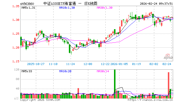 2月24日,中证A500ETF海富通(563860)开盘涨0.93%,报1.308元。中证A500ETF海富通(563860)重仓股方面,宁德时代开盘涨2.00%,贵州茅台涨2.40%,中国平安涨0.74%,中际旭创涨2.07%,紫金矿业涨4.53%,招商银行涨1.27%,新易盛涨0.52%,美的集团涨1.45%,兴业银行涨0.32%,长江电力涨0.50%。