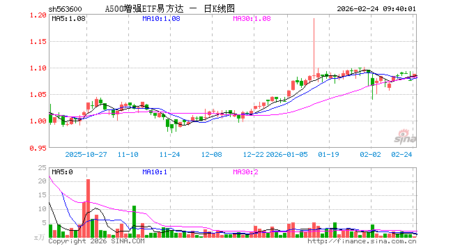 2月24日,A500增强ETF易方达(563600)开盘涨0.46%,报1.081元。A500增强ETF易方达(563600)重仓股方面,宁德时代开盘涨2.00%,贵州茅台涨2.40%,中国平安涨0.74%,中际旭创涨2.07%,招商银行涨1.27%,紫金矿业涨4.53%,美的集团涨1.45%,新易盛涨0.52%,兴业银行涨0.32%,中信证券涨0.51%。