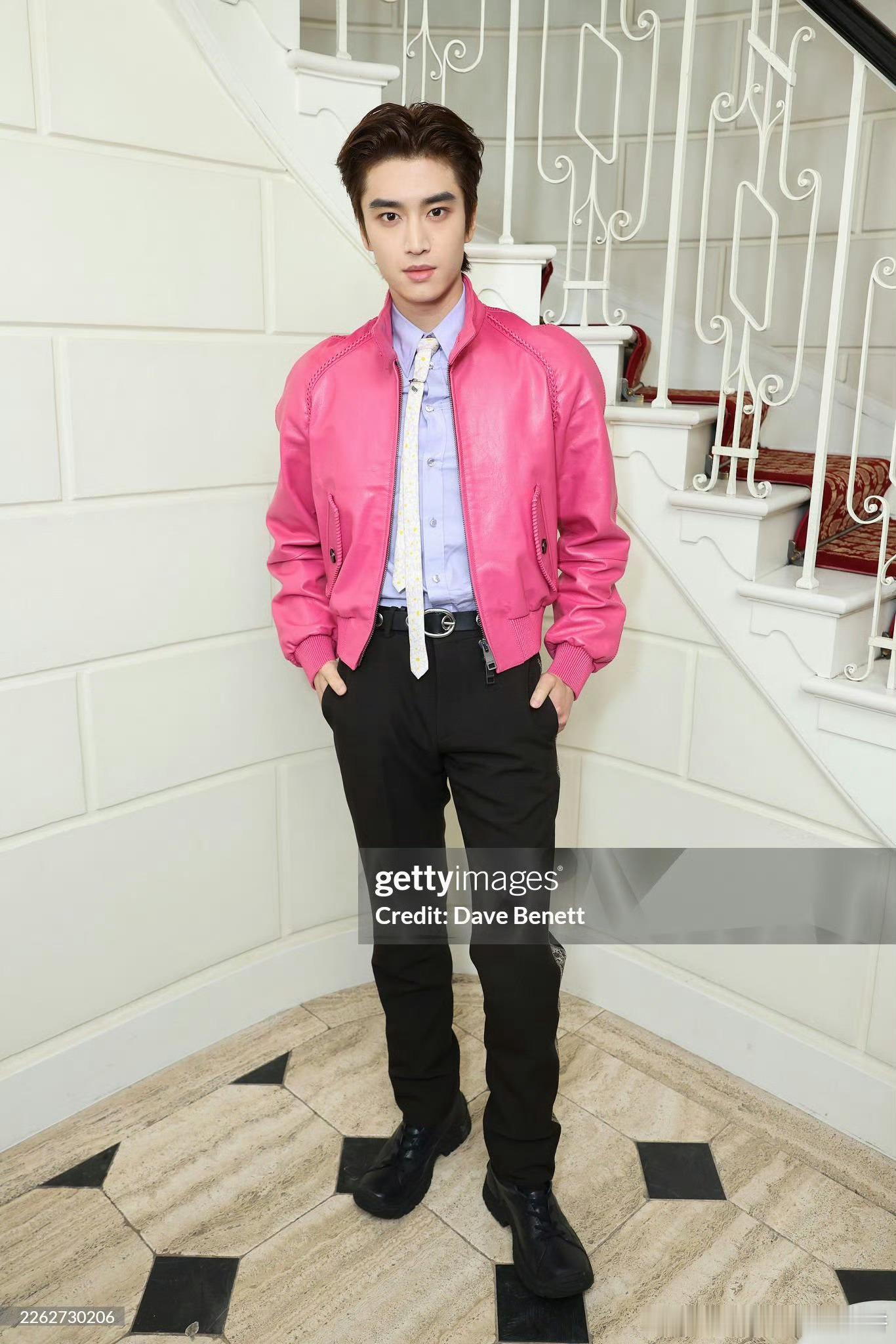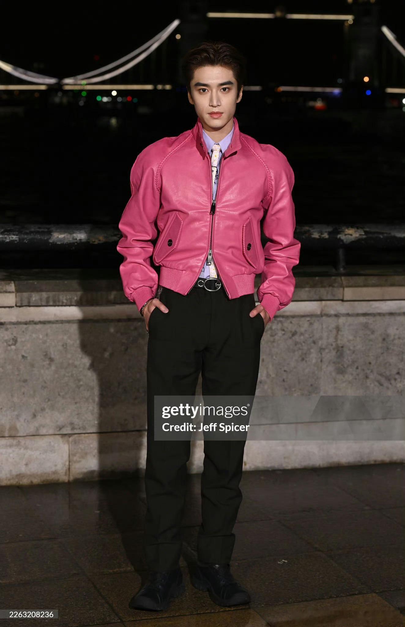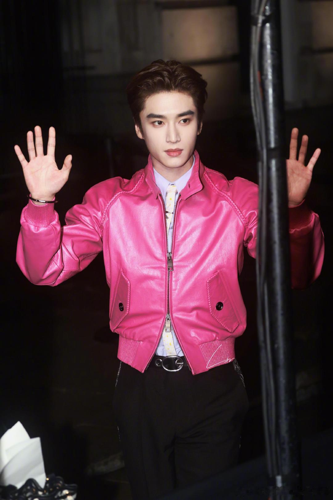 张康乐亮相伦敦时装周 Burberry 大秀,造型来自Burberry 2026 春夏系列粉色皮衣,他把粉色穿的很有风格