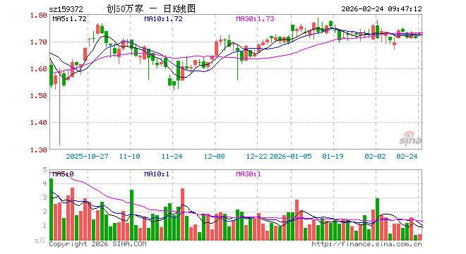 2月24日,创业板50ETF万家(159372)开盘涨0.99%,报1.726元。创业板50ETF万家(159372)重仓股方面,宁德时代开盘涨2.00%,中际旭创涨2.07%,新易盛涨0.52%,东方财富涨0.54%,阳光电源涨1.74%,胜宏科技涨1.59%,汇川技术涨2.54%,迈瑞医疗涨1.10%,天孚通信涨5.27%,亿纬锂能涨1.80%。