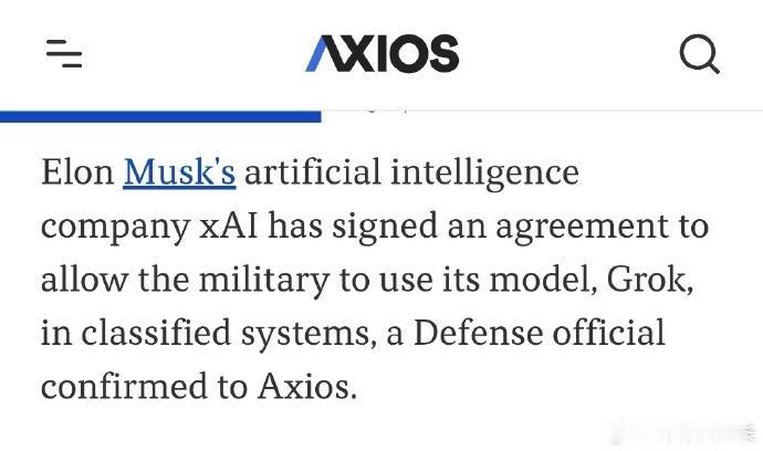 据美国国防部官员向阿克西奥斯新闻网站透露,埃隆·马斯克的人工智能公司艾克斯人工智
