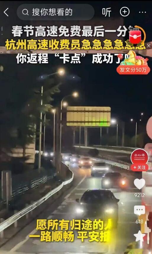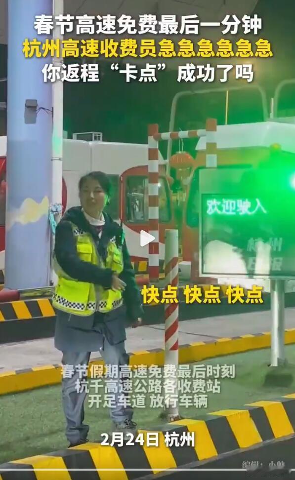 每年固定节目,肯定有“压哨”赶上免费的,也一定有差一秒钟赶不上免费的。其实就不是很理解这种心态,为了图个免费,急急火火的,路上还堵的厉害,导致真正需要赶路的人不得不花费更多时间。不是我发牢骚哈,每年高速免费期间我都得被这么折腾一下子,本来能顺顺利利的开,结果被好多大聪明给秀到了。感觉这种时候最开心的就是各种摄影爱好者了,对着一片红色的车流,随便拍都是大片…..高速免费最后1分钟实拍高速免费最后1分钟收费员高喊快快快