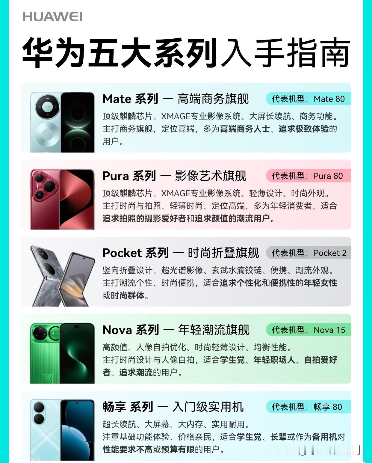 作为通信设备起家的厂商,华为手机在信号接收方面表现非常出色。即使在电梯、地下车库、高铁等弱网环境中,也能保持通信的稳定性。部分机型还支持天通卫星通话和北斗卫星消息,可以在完全没有地面信号的极端情况下进行求救或通信,带来十足的安全感。 华为已建立起自成一派的XMAGE影像系统,在色彩还原、夜景拍摄和长焦抓拍方面表现突出。其算法优化使得普通用户也能轻松拍出细节清晰、色彩自然的照片,成片率很高,尤其在复杂光线场景下表现稳健。 如果您拥有或计划购买华为的其他设备(如平板、笔记本、手表、智慧屏等),那么鸿蒙系统(HarmonyOS)的多设备协同体验是其核心竞争力。通过“超级终端”功能,设备间可以一拉即合,实现跨设备文件传输、多屏协同、任务接续等,极大提升办公和生活效率。 鸿蒙系统在长期使用的流畅度和安全性上表现优异,官方通常会承诺长达数年的系统更新和维护,确保手机久用不卡顿。华为的高端旗舰机型定价通常较高,可能不适合预算有限的消费者。不过,近期部分机型因促销活动或新品发布,价格有所下调,出现了不错的入手时机。 搭载麒麟芯片的机型,其性能定位并非追求极致的理论跑分,而是更侧重于日常使用的稳定性和能效比。对于追求极致游戏体验的用户来说,这一点需要纳入考量。 nova 14 Ultra 约2500-3000元 轻薄手感、潜望长焦、卫星通信下放 预算有限但追求喜爱拍照的年轻人,Mate 80 约4000-5000元 全能水桶旗舰、麒麟芯片、均衡体验 追求长期稳定使用、一步到位的商务或职场人士,Pura 80 Pro 约4500元起 影像能力突出、超大电池、双长焦 摄影爱好者、对影像有高要求的用户,Mate X6 折叠屏 大屏办公、分布式玄武架构、卫星通信 商务人士、追求高效多任务处理和独特形态的用户 如果您非常看重信号稳定性、独特的影像风格、跨设备的生态体验,并且预算充足,那么华为是一个非常值得考虑的选择。