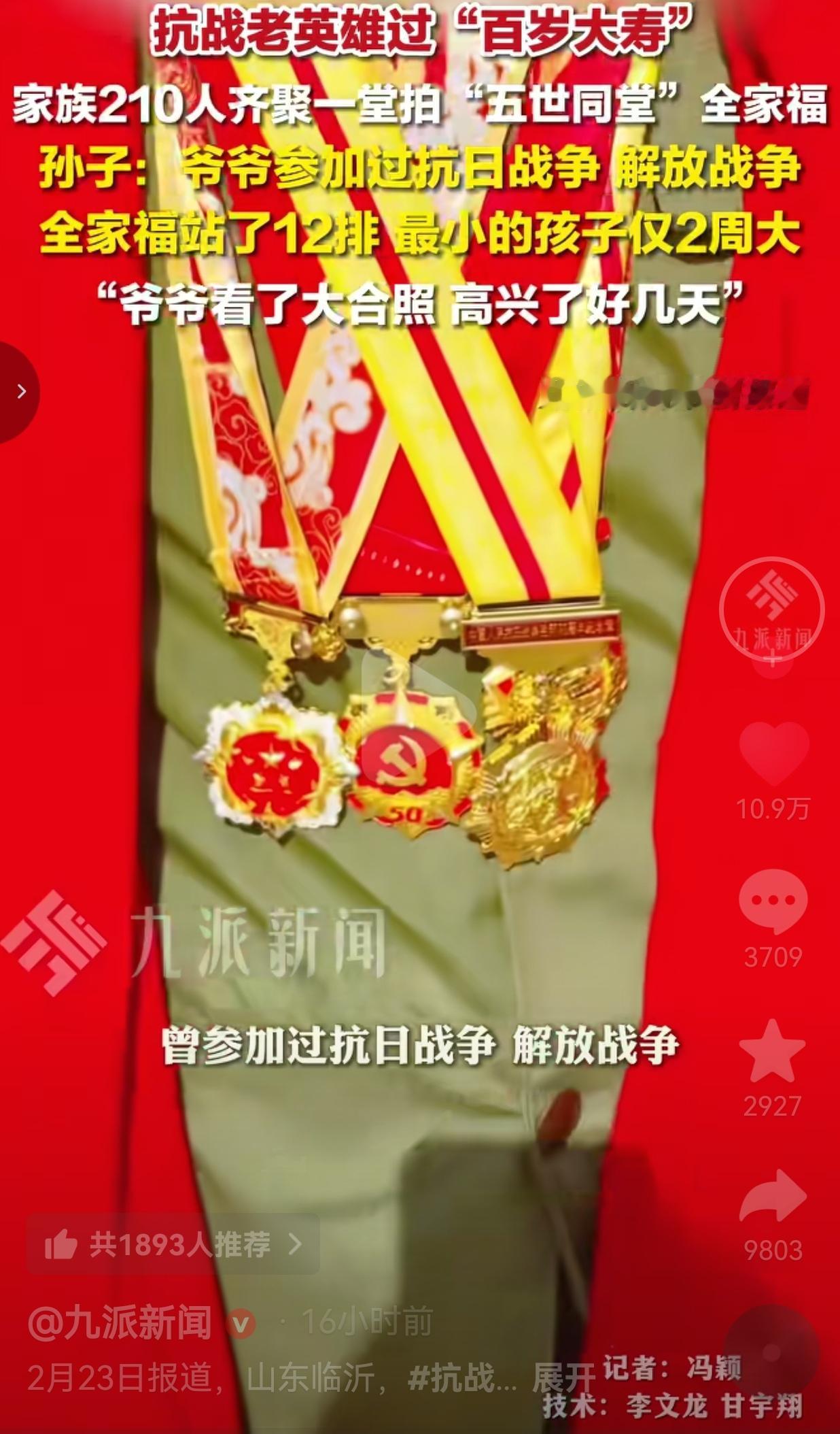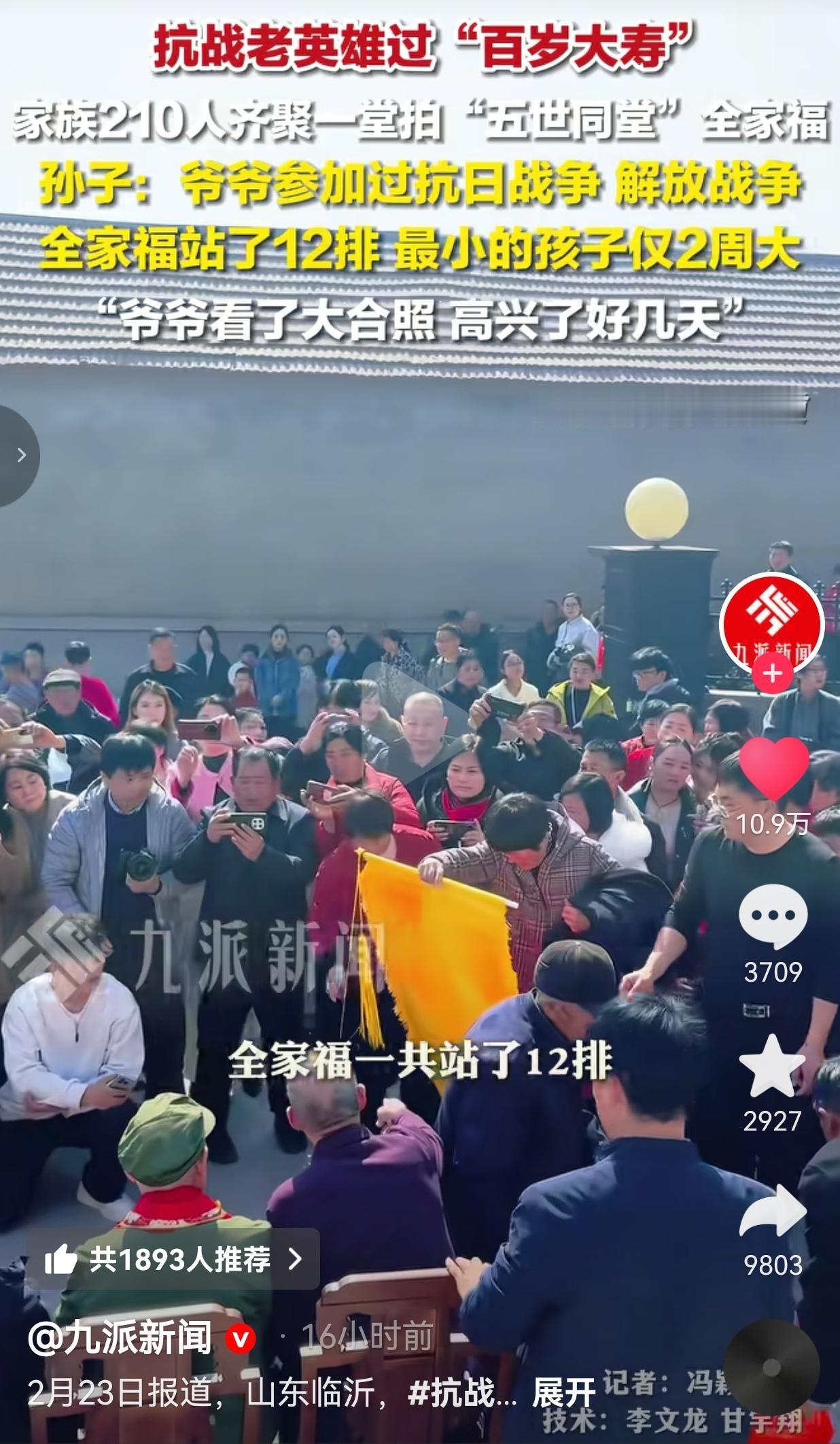 正月初三,山东临沂的一个农家院里,张爷爷迎来了他的百岁大寿。 他是一名抗战老英雄,参加过抗日战争、解放战争,胸前挂满了沉甸甸的勋章,每一枚都闪着枪林弹雨里淬出的光。 这一天,家族里210口人从四面八方赶回来,最远的甚至从广州千里迢迢赶回家,整个家族240人里,有210人齐聚一堂,整整站了12排,最小的孩子才2周大,拍下了这张“五世同堂”的全家福。 孙子说,爷爷捧着这张大合照,高兴了好几天,逢人就拿出来看,笑得眼睛都眯成了一条缝。 照片里,他和老伴并肩坐着,身边是笑逐颜开的儿孙,整个院子里喜气洋洋,满是团结互助的暖意。 要我说,这不仅仅是一张全家福啊,这还是一个民族的脊梁,和他亲手守护下来的、热气腾腾的人间烟火。 百岁的他,头发白了,背也驼了,但当他穿上那身几十年前的旧军装时,戴上那些闪着光的勋章时,眼神里的光,比任何时候都亮。 那些勋章,是他在枪林弹雨中拼出来的荣耀,是他为我们今天的安稳日子,流过的血、扛过的难。 网友看到后评论说: “他守护了我们的国家,我们守护了他的晚年。这才是最好的传承。” 也有的网友说:“五世同堂,国泰民安。这就是他当年拼了命想要守护的盛世啊。” 还有的网友说:“这才是真正的‘家有一老,如有一宝’,他是全家的宝,更是我们整个民族的宝。” 我们总说要铭记历史,可铭记不是停在嘴上,而是要看见这些活生生的老人,看见他们的付出,也看见他们的平凡。 他是战场上的英雄,也是家里的爷爷、父亲、丈夫。他一辈子教育后辈要孝敬父母、尊老爱幼,把这份家风刻进了每一个子孙的骨子里,也用一生的坚守,换来了儿孙满堂,换来了我们今天的岁月静好。 这件事最戳人的地方,是它让我们看到了“传承”最真实的样子。 不是什么惊天动地的大事,就是一代又一代人,把对国家的爱、对家人的责任,像接力棒一样传下去。 张爷爷用一生守护了我们的国家,他的儿孙们,用一场热热闹闹的寿宴,用跨越千里的奔赴,守护了他的晚年。 这就是最好的家风,也是最动人的家国情怀。 致敬革命老兵!