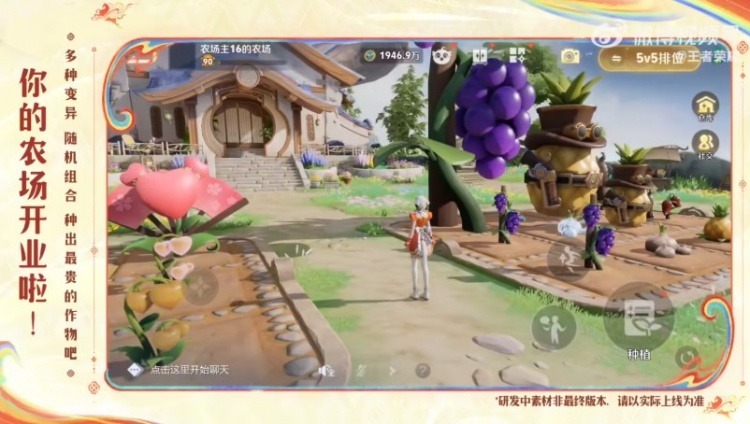 官方预告视频显示,农场玩法提供数十种作物种植,支持自由转动视角等操作,预计还拥有升级田地、作物变异等玩法。同时,部分作物还拥有英雄的特征,例如酷似马可波罗的“马可菠萝”、小乔的扇子等。