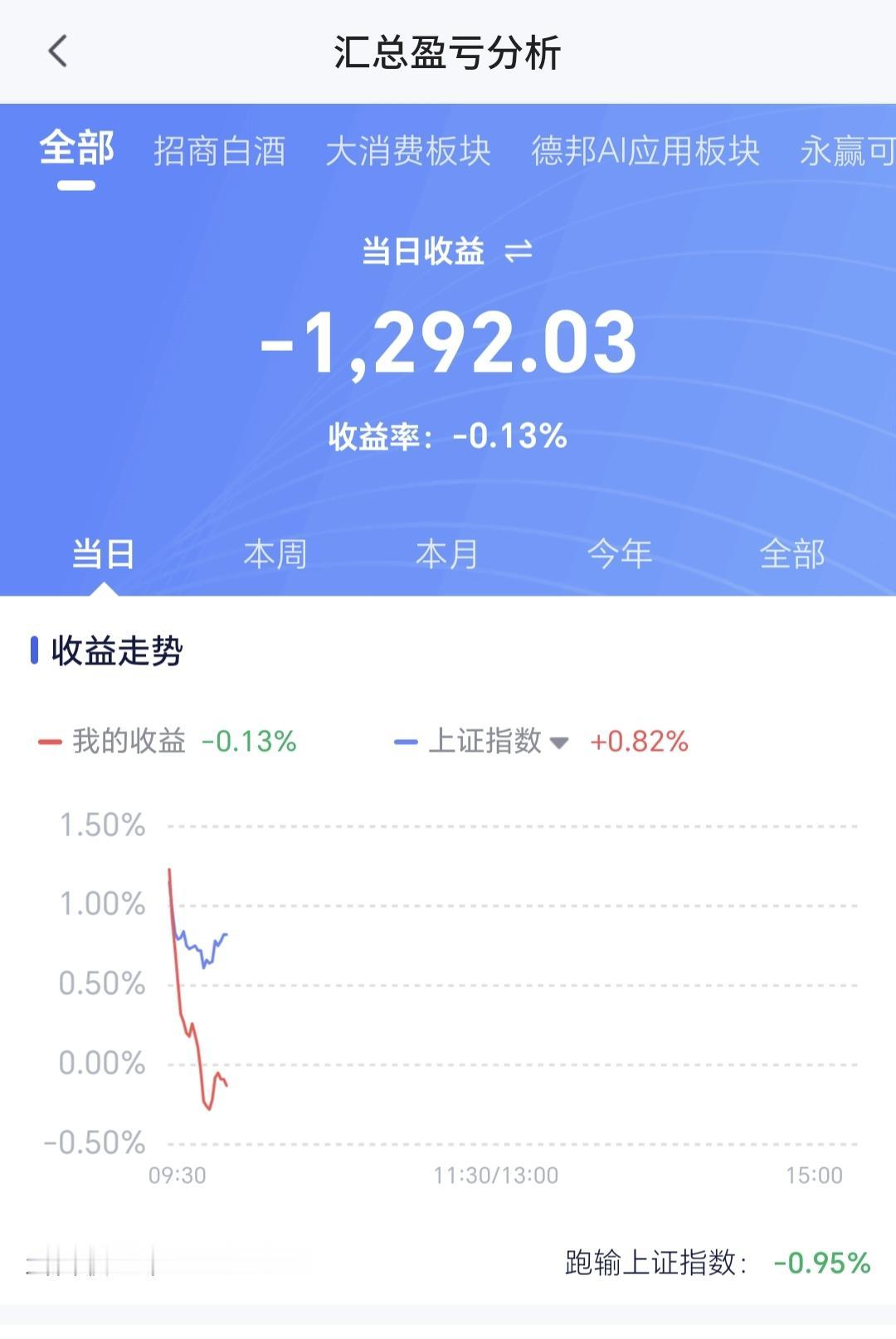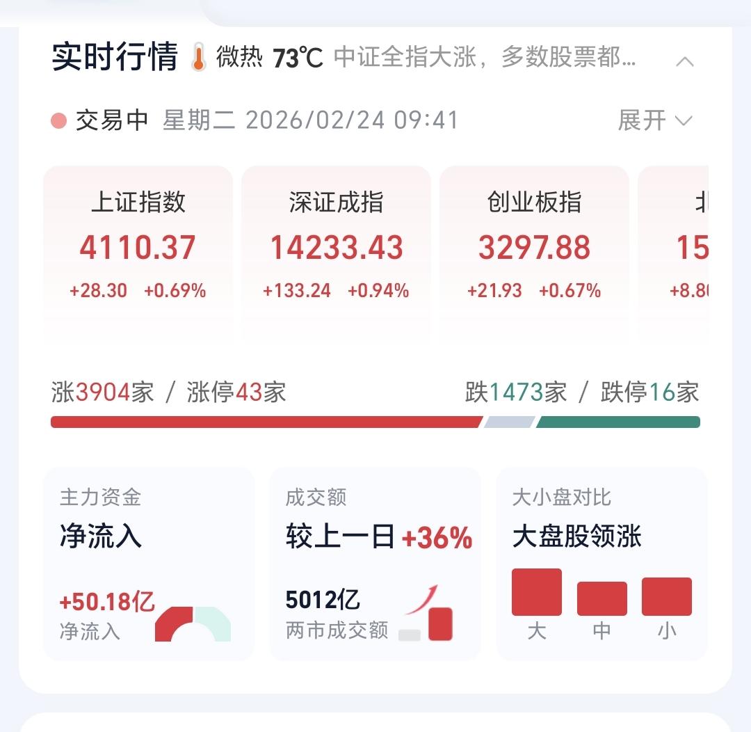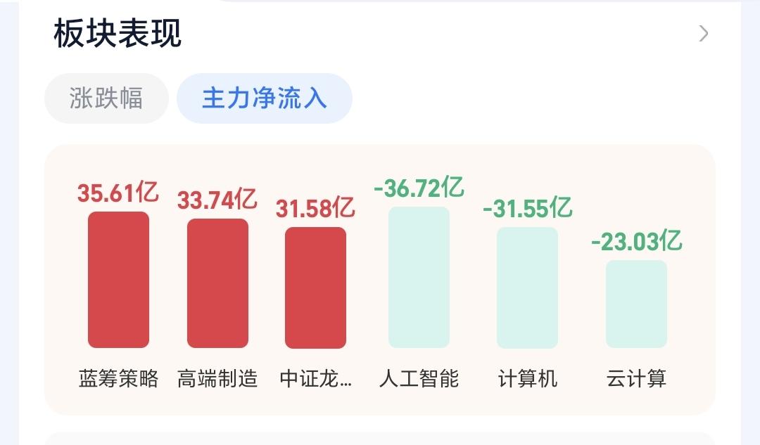 基金:AI应用板块大跌,什么时候可以考虑进场 今天市场高开,三大指数都是高开,创业板指开盘上涨了1.70%,开于3331点,上证指数开盘上涨了1.15%,开于4129点,高开幅度都超过了1%以上,这样的高开幅度超出了我的预期,我本以为高开幅度会在0.5左右。 开盘以后指数回落,三大指数的上涨幅度都回到了1%以内,黄色线在蓝色线下方带两条线之间的敞口不大,这样的情况下,还需要继续观察两条线的位置会不会有变化,观察黄色线能不能上穿蓝色线,并在拉开与蓝色线的距离。 两市累计成交5012亿,相比于春节之前最后一个交易日放量了36%,市场上涨3900多家,下跌1400多家,上涨家数大幅度超过了下跌家数,涨停43家,跌停16家,跌停家数有点多,主力资金净流入50亿。 主力资金净流入最多的三个板块是:蓝筹策略板块,高端制造板块,中证龙头板块,主力资金净流出最多的三个板块是:人工智能板块,计算机板块,云计算板块。 市场上涨幅度最大的三个板块是:黄金板块,有色金属板块,油气资源板块下跌幅度最大的三个板块是:AI应用板块,传媒游戏板块,半导体材料板块。 AI应用板块也就是软件板块,春节之前上涨突破了日线级别下跌通道的上轨线,今天的回落又来到了这个日线级别短期下跌通道上轨线附近,而且已经低于突破时候的位置,如果不能尽快上拉,而是重新回到下跌通道内,春节之前的突破就是假突破。 AI应用板块周线级别还是处于上涨通道内,今天的下跌并没有跌破上涨通道的下轨线,长线持有的人可以继续持有,到了上涨通道下轨线附近的时候再考虑要不要进场。 持有的基金盘中估值下跌了1292元,亏损率0.13%,跑输了上证指数的上涨幅度,上涨幅度最大的三个板块是:5G板块,创业板指,沪港深消费,下跌幅度最大的三个板块是:半导体板块,先进制造板块,白酒板块。 今天就是一个震荡走势,整体上是在一个大的震荡格局当中,还没有进行方向的选择,你觉得大方向是选择向上,还是选择向下。