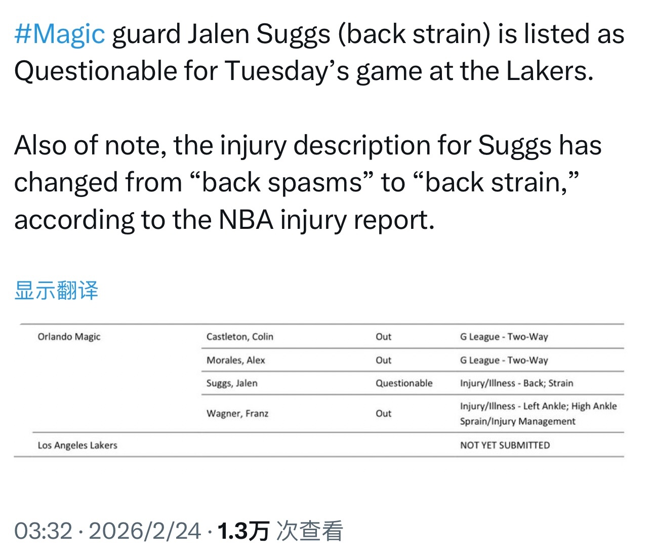 魔术后卫萨格斯(背部拉伤)明天对阵湖人出战成疑,他由于背部痉挛缺席了过去两场比赛