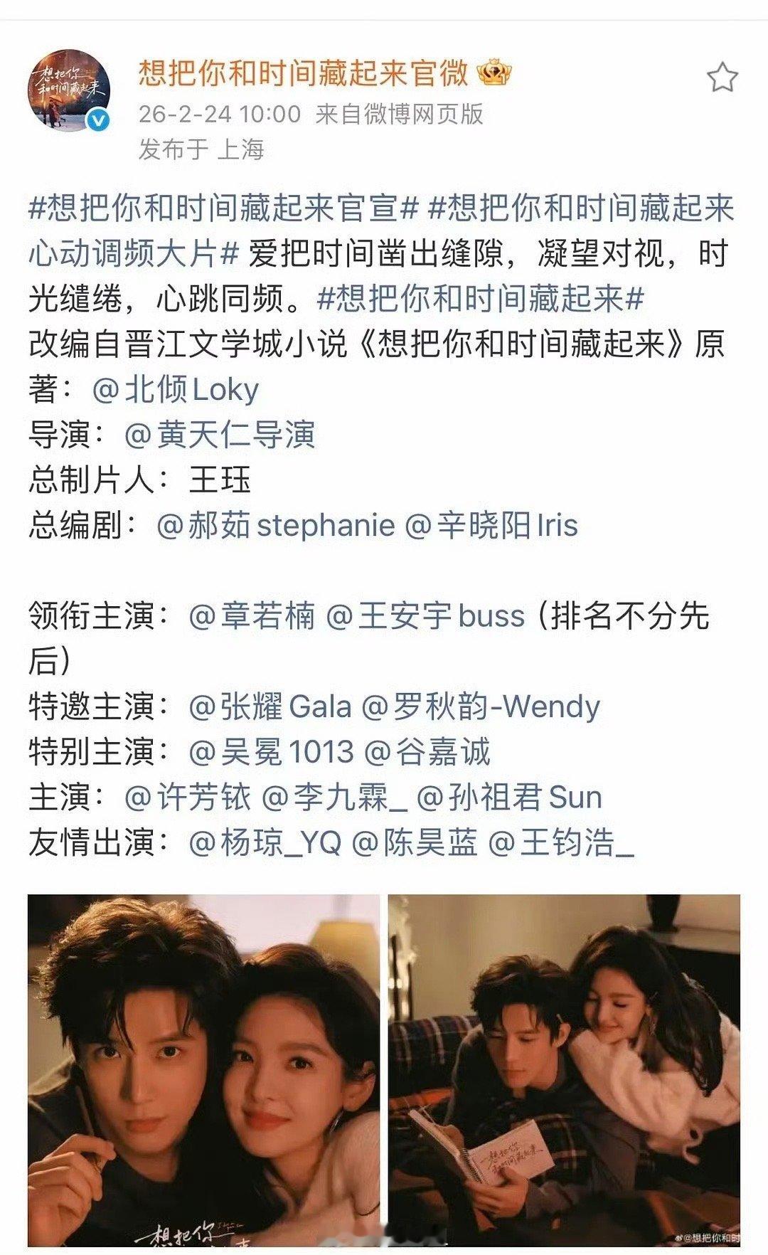 章若楠王安宇首搭cp这下粉丝悬着的心可以放肚子里了叭,章若楠、王安宇新剧《想把你和时间藏起来》官宣了,男女主的排名不分先后,看来是平番合作了,新剧导演黄天仁,神颜首搭cp,一整个氛围感拉满了啊~章若楠王安宇新剧导演黄天仁