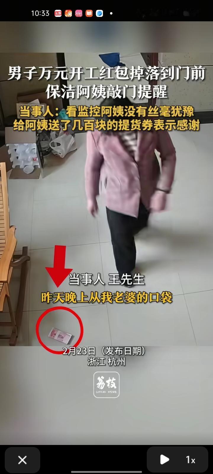 2月23日,浙江杭州。男子的万元开工红包掉落在门前,起来准备上班时发现有人在敲门,门一打开,对方就说有一万块掉在地上。随后,男子跑到物业那里给阿姨送几百元的取货券,看了监控才发现阿姨没有丝毫犹豫,可以说阿姨这人很好。