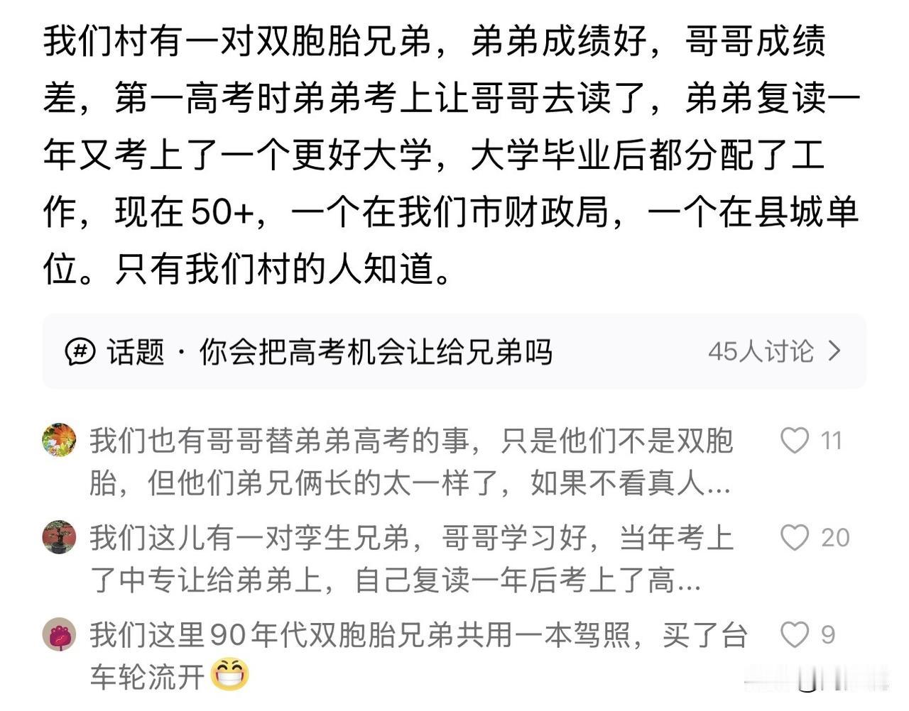 “难以置信!”网友爆料:村里一双胞胎兄弟,当年弟弟成绩好,哥哥成绩差,第一年弟弟让哥哥顶替读大学,他则复读一年考上更好的大学。如今,一个在市财政局,一个在其它单位。 看完这事,周少真被震惊到了,属实难以置信。没想到这种顶替的现象是真的存在,之前看电视剧,高加林就被发小顶替,觉得电视剧上才这么演,没想到如今成了真事。那么问题来了,这种现象村里人都知道,为什么没人去举报呢?#寻美三湘# #周少说教育#