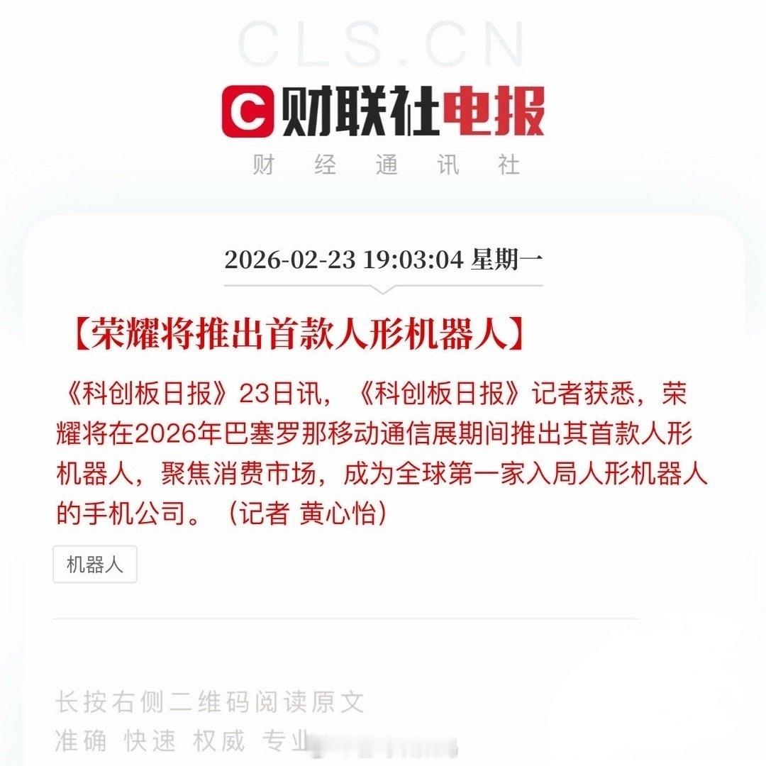 荣耀MWC2026 惊喜很多,不只有荣耀Magic V6 和荣耀ROBOT PHONE ,还将推出首款人形机器人,探索未来AI生活,成为全球第一家入局人形机器人的手机公司。未来人形机器人将走进千家万户,给我们的生活带来更多便利。荣耀将推出首款人形机器人