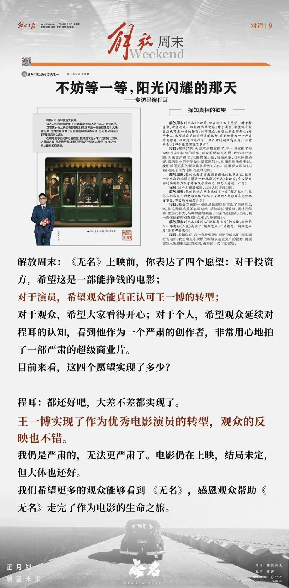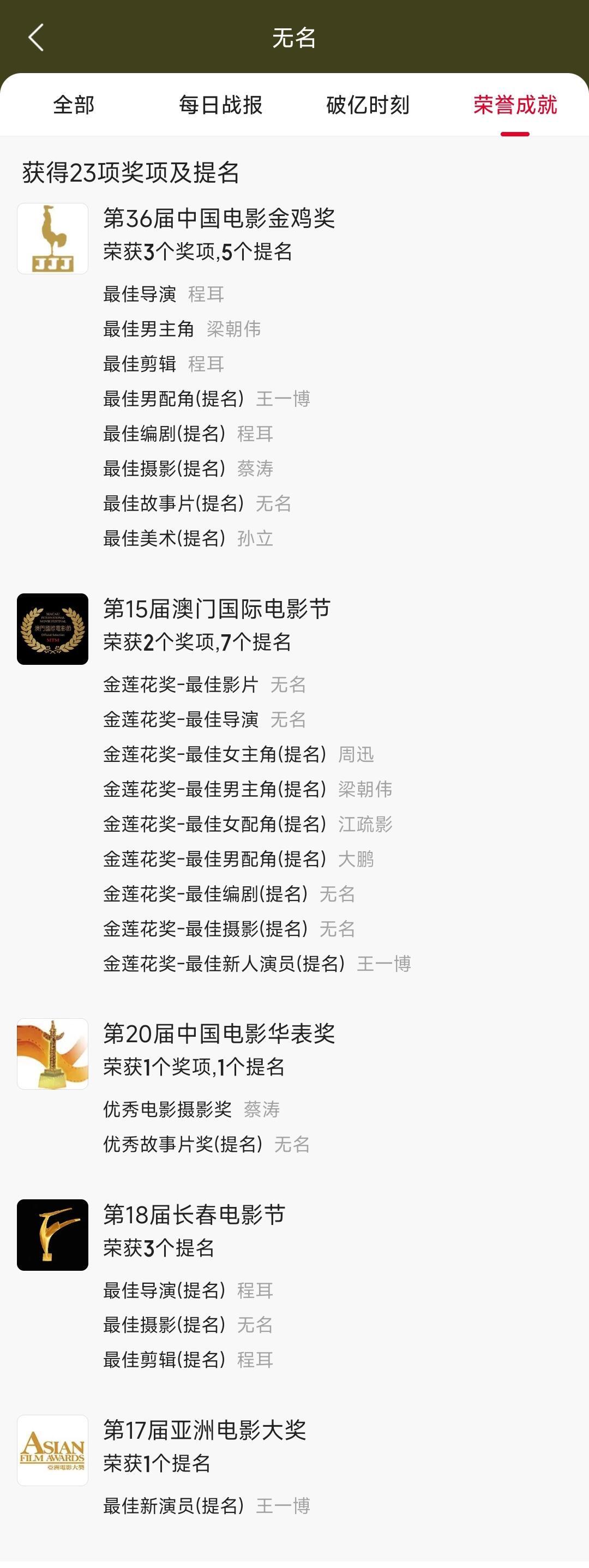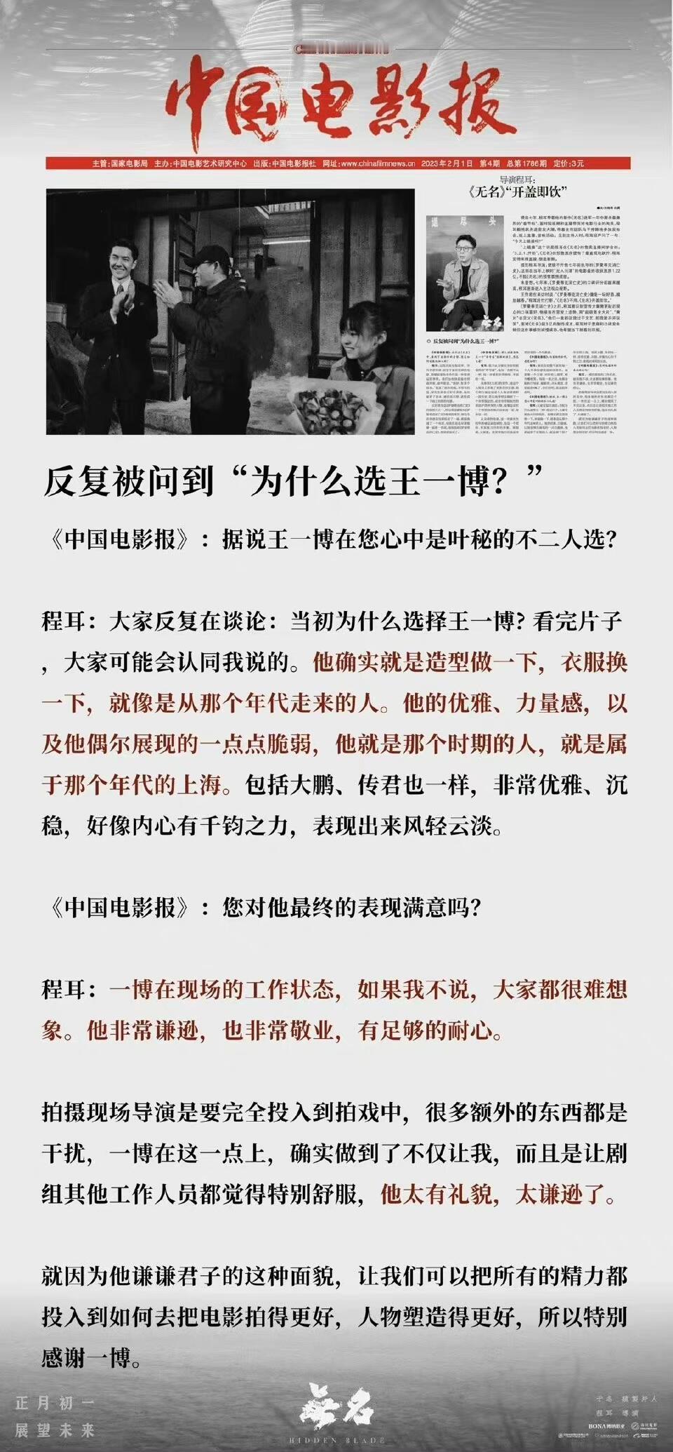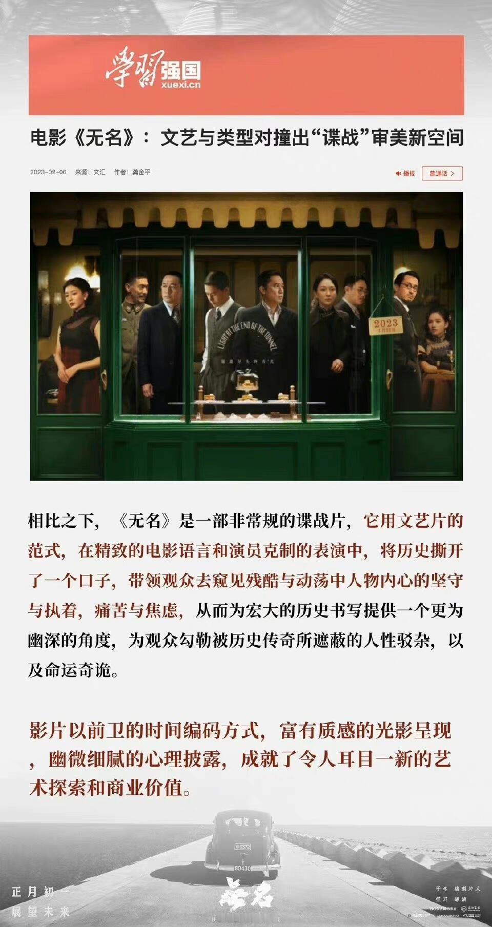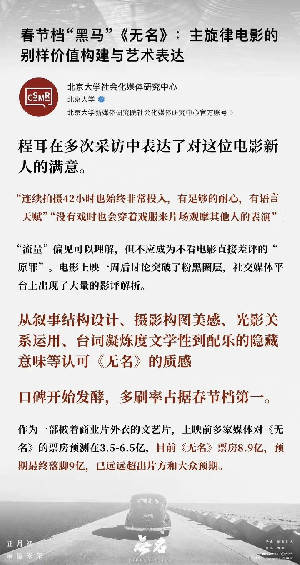 真正的春节档电影逆袭黑马奇迹——电影无名映前预测4亿,用最低的排片靠过硬的口碑质量和主演们、王一博的演技,不断逆袭接连逆跌,最终票房9亿+,博纳门面,金鸡8提3拿奖。