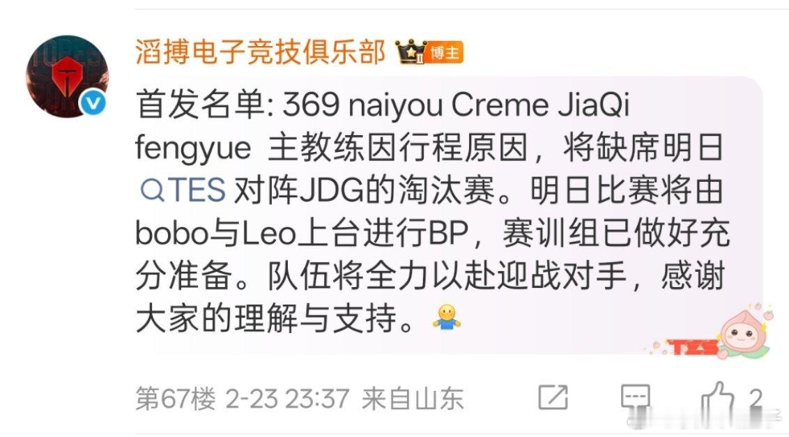 TES回应Poppy教练缺席是“行程原因”,那些说没买到春运票的有点扯,我盲猜是中国台北队亚运会教练选拔这种事给耽搁了。LPL第一赛段淘汰赛 JDG对战TESTOP_ESPORTS