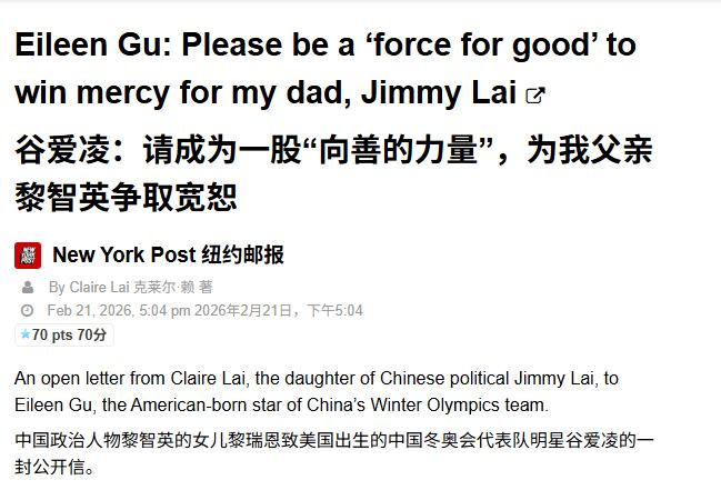 黎智英女儿黎采写公开信,恳请谷爱凌为父亲发声。 呼吁谷爱凌利用自身影响力,为黎智英争取获释,并促请当局能出于人道,使黎智英余生安享晚年。 这事一出来,网上吵翻了天,但很少有人真正扒透背后的门道,大多是骂一句碰瓷就过了,今天咱们就用大白话,好好说说这事儿到底有多离谱。 首先得明确一点,这封信不是什么真情流露的求助,从头到尾都是一场精心算计的表演。 黎采选了《纽约邮报》这个平台,还特意用英文投稿,没选中文媒体,说白了就是打给外国人看的,打给那些想干涉中国内政的势力看的。 她知道谷爱凌的影响力,不管是在国内还是国外,都是自带流量的公众人物,只要把谷爱凌拉进来,这事就能出圈,就能获得所谓的“关注”,哪怕这份关注全是批评和质疑,对她来说也不算亏。 有人可能会问,她为啥不找别人,偏偏找谷爱凌? 答案很简单,找别人没用。 谷爱凌的身份很特殊,既是中国运动员,又在国外有很高的知名度,而且一直被贴上“正能量”“有影响力”的标签。 黎采就是想利用这一点,绑架谷爱凌的口碑,一旦谷爱凌回应,不管是同意还是拒绝,都会被她拿来做文章;要是谷爱凌不回应,她又能暗戳戳卖惨,说谷爱凌“冷漠”“不敢发声”,怎么算她都想好了退路。 但最关键的问题是,这事从根上就站不住脚。 黎智英不是什么“冤枉好人”,他是因为勾结外国势力、危害国家安全,被香港法院依法判刑的,这是铁打的事实,是中国香港的司法案件,跟任何外人都没关系,更轮不到一个外国媒体和一个无关的运动员来指手画脚。 黎采心里比谁都清楚,她父亲的罪行确凿,靠正常途径根本不可能翻盘,所以才想出这种歪招,试图用舆论绑架司法,用公众人物的影响力搅浑水。 更讽刺的是,这封公开信登在《纽约邮报》上,却连个官方独立链接都找不到,只能在一些聚合网站上看到转载。 说白了,就连这家媒体都没把这封信当回事,只是把它当成一篇吸引流量的读者来信,根本不代表媒体立场,也没人真的相信,谷爱凌的一句话就能改变什么。 黎采费了这么大劲,搞了一场看似声势浩大的求助,到最后不过是一场自导自演的独角戏,除了引来一片骂声,什么都得不到。 其实这事的本质,根本不是“女儿为父亲求情”,而是一场赤裸裸的政治碰瓷,是某些人不甘心失败,试图借公众人物的热度,干涉中国内政、抹黑中国司法的小把戏。 他们低估了大众的判断力,也高估了自己的手段,以为靠一封公开信、绑上一个公众人物,就能颠倒黑白、混淆是非,却不知道,正义从来不会被舆论绑架,法律也从来不会因为这种无聊的表演而改变。 谷爱凌从头到尾都没回应,这其实是最聪明的做法。 一旦回应,就掉进了黎采设下的陷阱,不管怎么说都是错。与其浪费时间纠缠,不如专注于自己的事情,这本身就是对这种碰瓷行为最好的反击。 说到底,黎采的这场操作,既可怜又可笑。 可怜的是,她明明知道父亲罪有应得,却还抱着不切实际的幻想,用这种错误的方式挣扎。 可笑的是,她高估了自己的算计,低估了大众的眼睛,到最后只落得个“政治碰瓷”的骂名,成为大家茶余饭后的谈资。 这件事也给所有人提了个醒,不管是谁,不管有多大的诉求,都不能越过法律的底线,更不能试图用舆论绑架司法、干涉内政。 任何试图挑战中国法律、破坏国家主权的行为,最终都只会搬起石头砸自己的脚,这场徒劳的碰瓷,就是最好的例子。