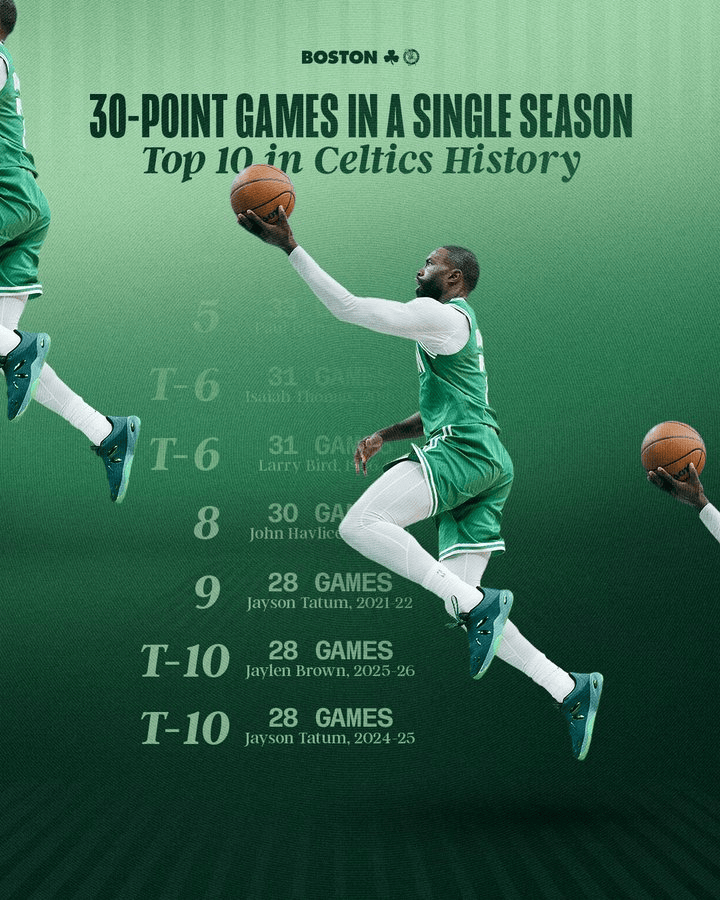 “杰伦-布朗本赛季28次砍下30+,跻身队史前十!”