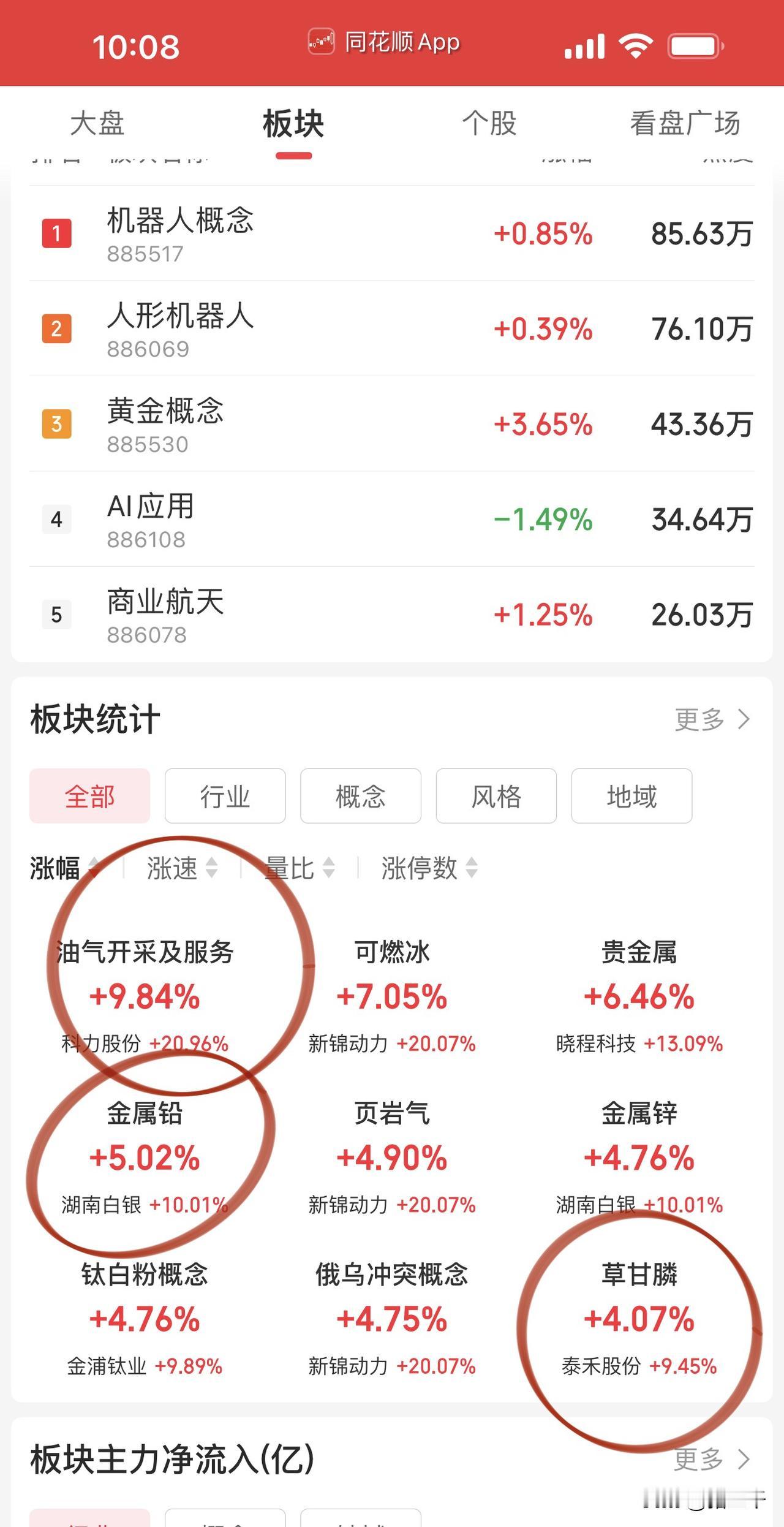 开盘半小时有色、石油、煤炭、科技扩产领涨! 有色金属主要是白银、黄金补涨, 白银有色等涨停, 锂矿方向走强但力度差些意思; 石油板块大面积涨停, 中曼石油、中海油服优质标的继续领涨; 煤炭兖矿能源yyds! 科技扩产MLCC和存储上游原材料大涨, 风华高科、宏和科技、深南电路大涨! 另外春耕概念化肥股: 云天化、川金诺、泰禾股份等大涨。 领跌方向是影视传媒, 中国电影和光线传媒居然跌停,打脸了! 机器人果然是冲高回落…