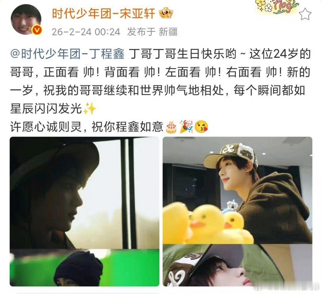 宋亚轩发博祝丁哥24岁生日快乐!哈哈哈小宋好会夸人!看得人又开心同时心里暖暖的