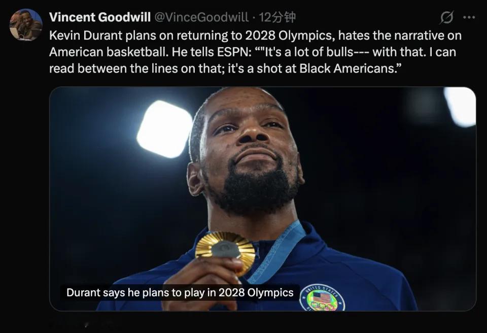 火箭球星杜兰特接受采访时透露,他计划出战2028年在洛杉矶举行的奥运会,并补充说他不喜欢围绕草根篮球的种种说法杜兰特曾四次获得奥运金牌,是美国男篮在奥运会历史上的得分王。下一届奥运会时,他将年近40岁