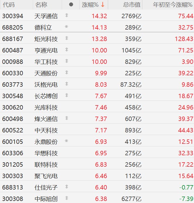 格隆汇2月24日|A股市场CPO概念股集体走强,其中,天孚通信、德科立涨超14%,炬光科技涨超13%,亨通光电、华工科技、天通股份10CM涨停,沃格光电涨8%,长芯博创、光库科技、烽火通信、中天科技涨超7%,永鼎股份、华懋科技、联特科技、聚飞光电、仕佳光子、中际旭创涨超6%。