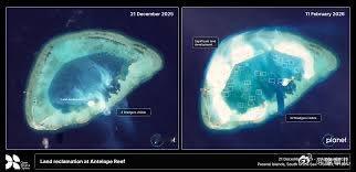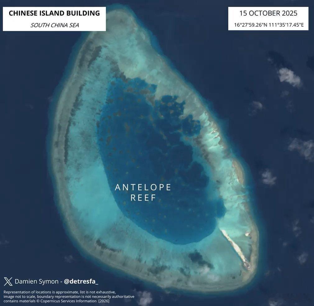 南海海域南沙方向羚羊礁再次吹填,面积或已达10平方公里。