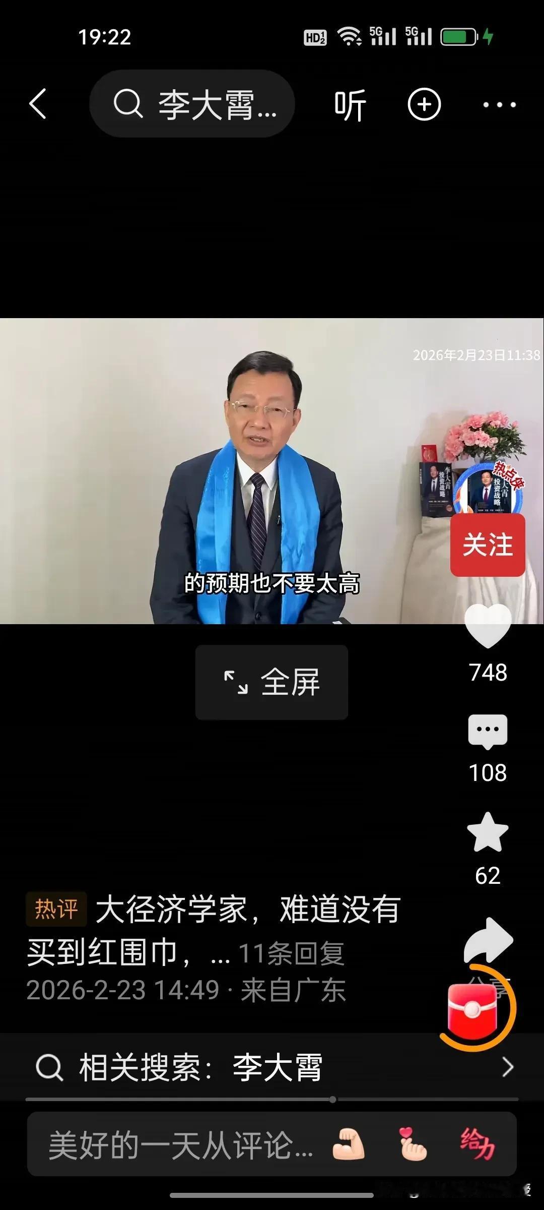 李大霄昨天还是谨慎了啊!罕见戴着蓝围巾发视频,声称今天可能会小幅高开,可能有小红包,预期不要太高。原因就是美股见顶,巴菲特持大量现金,美股如果昨晚大跌今天酒另当别论。 可是今天A股就是这么硬气,开门红,无视昨天美股三大指数大跌,也无视港股今天大跌,在资源股扛大旗下,上涨近1%,4200家个股飘红,除了院线股和AI应用走弱,其他板块都没有受到外围股市太大的影响。 李大霄一直都是唱多派,但是昨天的预判确实保守了,认为A股的走势还是会跟着美股的表现而定夺。事实证明,A股是有能力走出独立行情的慢牛行情的,节前最后一天大跌的“蛇尾”就是黄金坑,外盘扰动不改内资信心,马年开局,A股自己说了算!