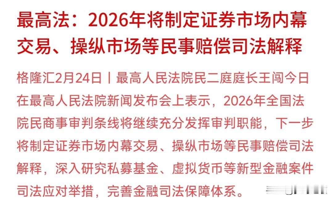 投资者的重磅利好来了,民事赔偿将会有法可依 以前法律只说“可以赔”,但没说怎么算损失、怎么举证、怎么告,法院判案没统一标准 。 这次最高法今年要出专门规则,让被内幕交易、操纵市场坑了的股民,打官司索赔更简单、更有谱、更容易拿到钱 。 说实话,现在的股民就是弱势群体,尤其是资金相对较少的散户,不仅消息面知悉存在偏差,而且在时间上面更是有很大的劣势。 这次的规则就是为了减小股民的损失,让投资者拥有更大的信心。 这次的规则不仅包括股市,还有基金和虚拟货币等,基本上涵盖了所有投资品种。