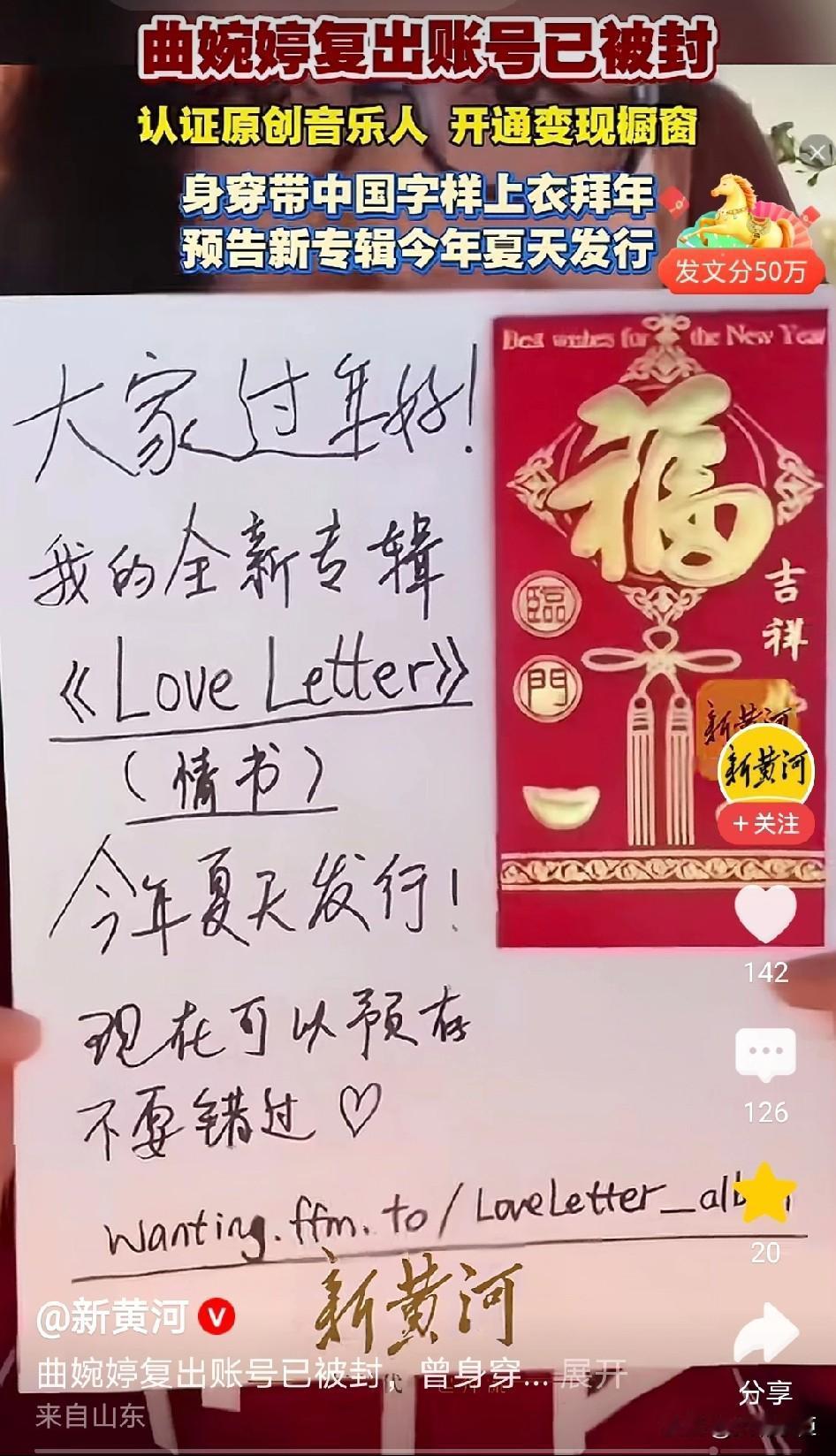 原来曲婉婷一直在试水复出啊。 春节期间,曲婉婷在国内社交平台开通账号,并借拜年推销自己的新专辑,结果账号被网友举报到封禁,复出失败。 很多人奇怪,以张明杰的涉案金额,足够曲婉婷一辈子衣食无忧了,她一辈子躺平都能过上富足生活。 大家不知道的,像她这种不能回国的二代,一直是国外帮黑 重点“关注”对象,这也是她之前高调宣传和副市长男友恋情的重要原因,说到底,和爱情关系不大。 再加上之前享受过众人追捧,上过春晚粉丝众多,现在在加拿大默默无闻的,内心多少有些失衡,而且她一直都觉得母亲挺冤的,不觉得自己问题有多大,于是隔一段时间就出来跳一下,可惜大家的眼睛都是雪亮的,注定不能让她如愿。