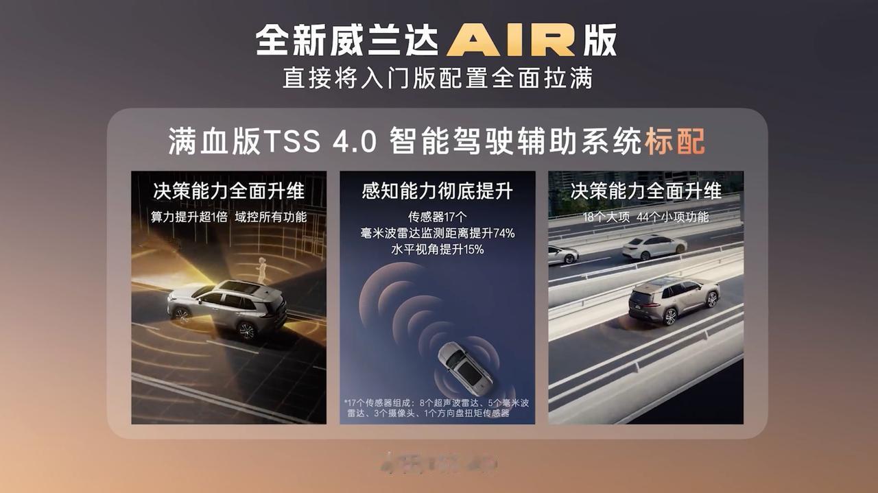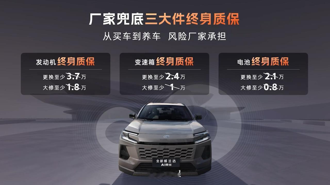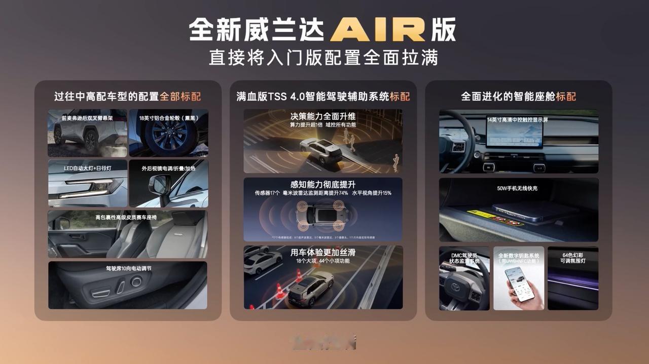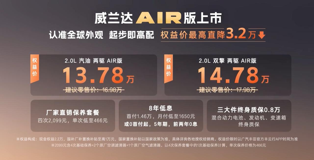 马年开工第一天,广丰如约而至上新,威兰达AIR版上市13.78万起。 虽然是AIR版,但是也把配置和权益都给足了。LED自动大灯、驾驶座的电动调节、满血的TSS 4.0辅助驾驶系统、14英寸高清中控屏、50W无线快充、64色氛围灯等以往中高配车型的配置,也都来到了AIR版上面。两驱车实现了四驱车的全场景应对能力,通过性也是妥妥的。 此外在服务上面,广丰也给出了厂家兜底的三大件终身质保,发动机、变速箱、电池终身质保,再加上厂家直销的一口价保养套餐,用车无忧。 2.0L汽油版13.78万元,2.0L双擎版14.78万元,还有8年低息等政策,广丰开年这波诚意够不够!【来自懂车帝车友圈】