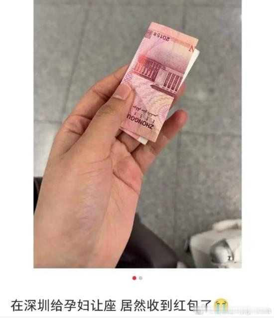 女子在地铁让座获孕妇百元红包:看她坐矮凳挺难受2月22日,网友小洛的一则帖子点赞过万,受到众多网友关注。在帖子中,小洛分享了自己在深圳地铁为孕妇让座后,收获百元红包的故事。据小洛回忆,21日晚7时,小洛在深圳五号线布吉站搭乘地铁,遇见了一位身着灰裙的孕妇,坐在自带的黄色小矮凳上。“她应该比我早上车,我刚坐下就注意到她了。明明设置有孕妇专座,却没有人给她让座。”小洛在帖子中写道:“我心里挺难受的,我让她坐,她还一直拒绝,说她有小椅子。可是椅子好矮,她坐下来腿都不知道怎么舒展开来,一点都不舒服。”孕妇最终接受了小洛的好意,小洛的暖心行动也收到了回报。在小洛下车前,孕妇塞给了她一百元红包,并祝她新年快乐。因为过于惊讶,小洛连感谢都未说出口,事后也表示非常后悔没有冲上车把钱归还。帖子意外收到众多点赞与评论后,小洛表示暂未在评论区中找到那名孕妇,“我觉得很可惜,想提醒她换成折叠椅会方便很多。祝她好运连连,生活愉快,生产顺利,平安健康。”同时,小洛称,看到评论区的许多网友分享自己的经历,有孕妇表示没有被让座过,呼吁大家多点爱心。
