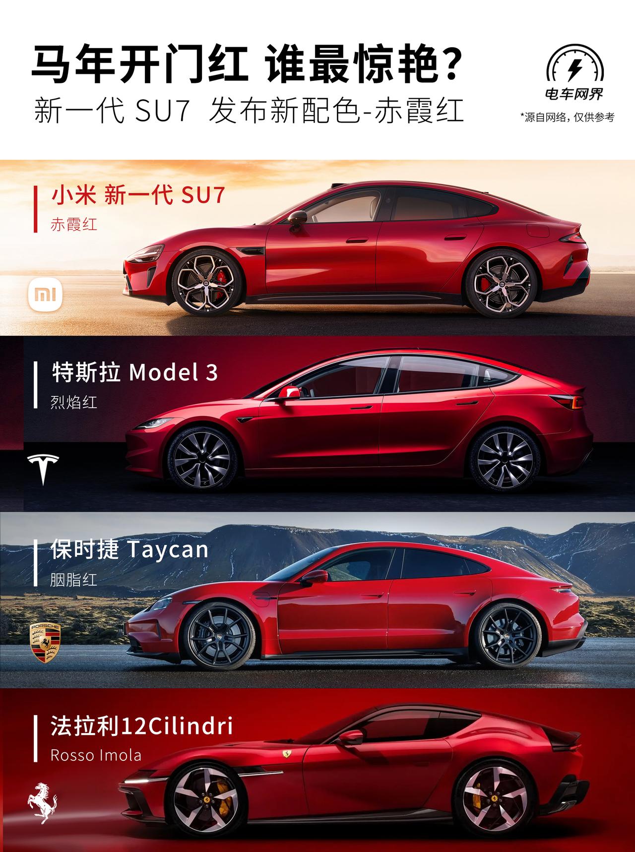 新年开工第一天,小米公布了全新一代小米SU7的新配色-赤霞红,大家觉得和特斯拉毛豆3的烈焰红、保时捷Taycan的胭脂红、法拉利的Rosso Imola红比起来,你最喜欢哪一抹红呢?【来自懂车帝车友圈】