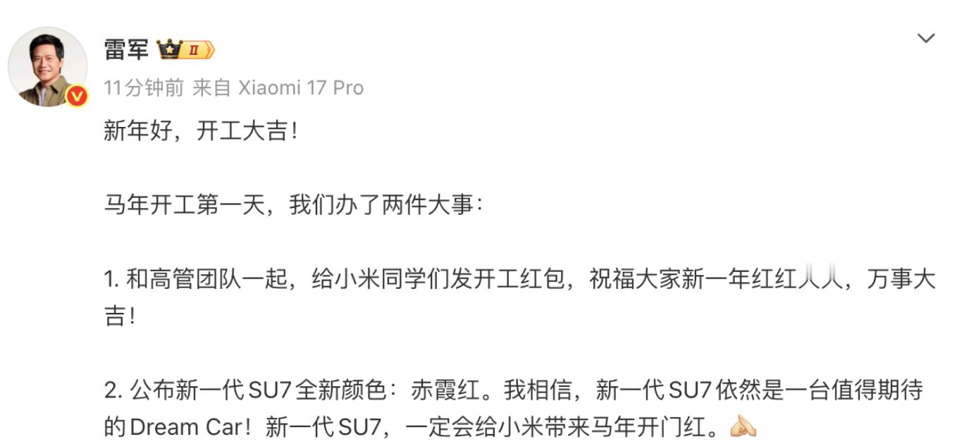 雷军公布新一代SU7新颜色赤霞红