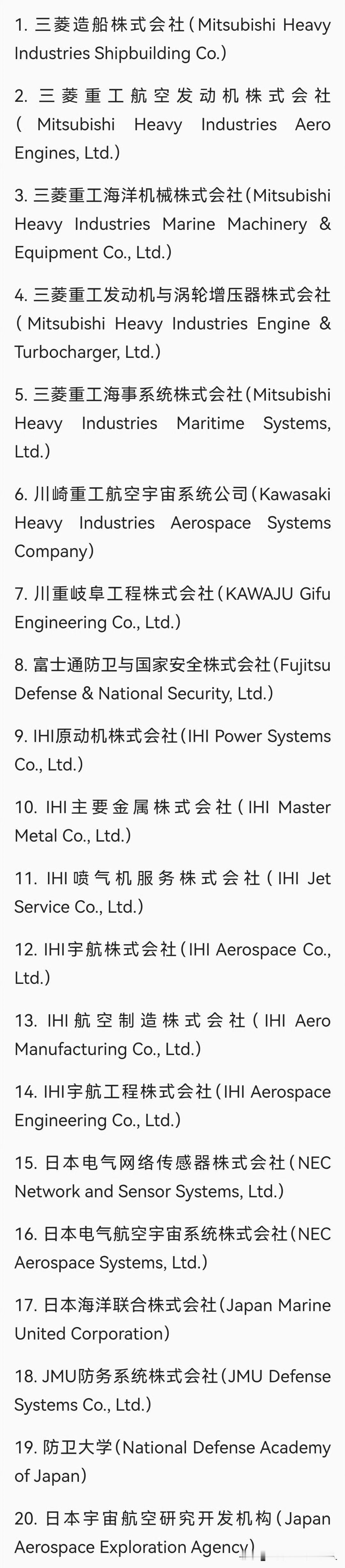 马年上班第一天——我商务部就发布出口管制管控名单涵盖日本陆海空天20家企业,其中: 1、1~5为三菱重工相关企业,是日本军工的绝对核心,涉及日本的海陆空天,包括金刚级、爱宕级等宙斯盾舰,F-2战斗机,10式主战坦克,12式反舰导弹及改进型,并承担建造一半的苍龙级及大鲸级潜艇,可以说是日本多域作战能力的基石,其产能和技术储备决定着日本的可持续作战能力; 2、6~7为川崎重工相关企业,是日本航空和潜艇领域的支柱企业,其产品包括日本P-1反潜巡逻机、C-2运输机等,承担另一半苍龙级和大鲸级潜艇建造等; 3、8、15和16中的富士通和NEC为日本电子和信息系统方面的关键企业,负责电子战系统以及C4ISR系统等,在日本的信息战和电子战领域起着核心作用; 4、9~14的IHI相关企业,是日本发动机产业的垄断商,负责向日本的飞机、军舰以及火箭等提供动力系统; 5、17和18JMU是日本第二大造船企业,涵盖散货船,油轮、LNG等商用船只,以及摩耶级驱逐舰和观测船等; 6、日本防卫大学,每年组织学员徒步数十公里前往靖国鬼社参拜; 7、日本宇宙航空开发研究机构(JAXA),则是日本的国家航天机构。