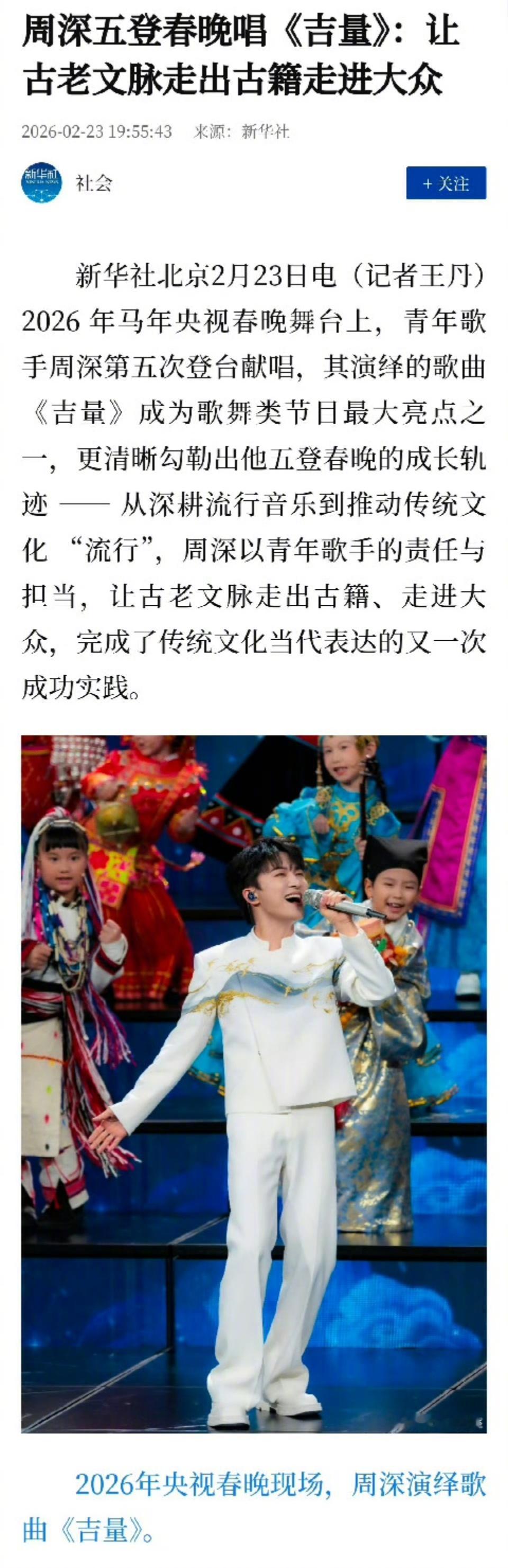新华社发文赞周深从初登春晚唱响《灯火里的中国》的家国情怀,到《山鹰和兰花花》实现跨国文明对话,再到如今以《吉量》让神话归人间、以同心向未来,周深五登春晚的舞台轨迹,勾勒出青年艺术家的成长之路。而《吉量》的意义不仅在于舞台呈现本身,更体现在其文化传播维度。六年五次登上春晚舞台,三次独唱,拿下两次歌舞节目收视第一,首首都是经典,周深用实力赢得了大众的认可。