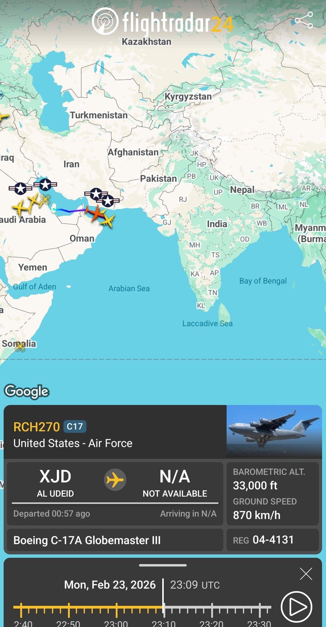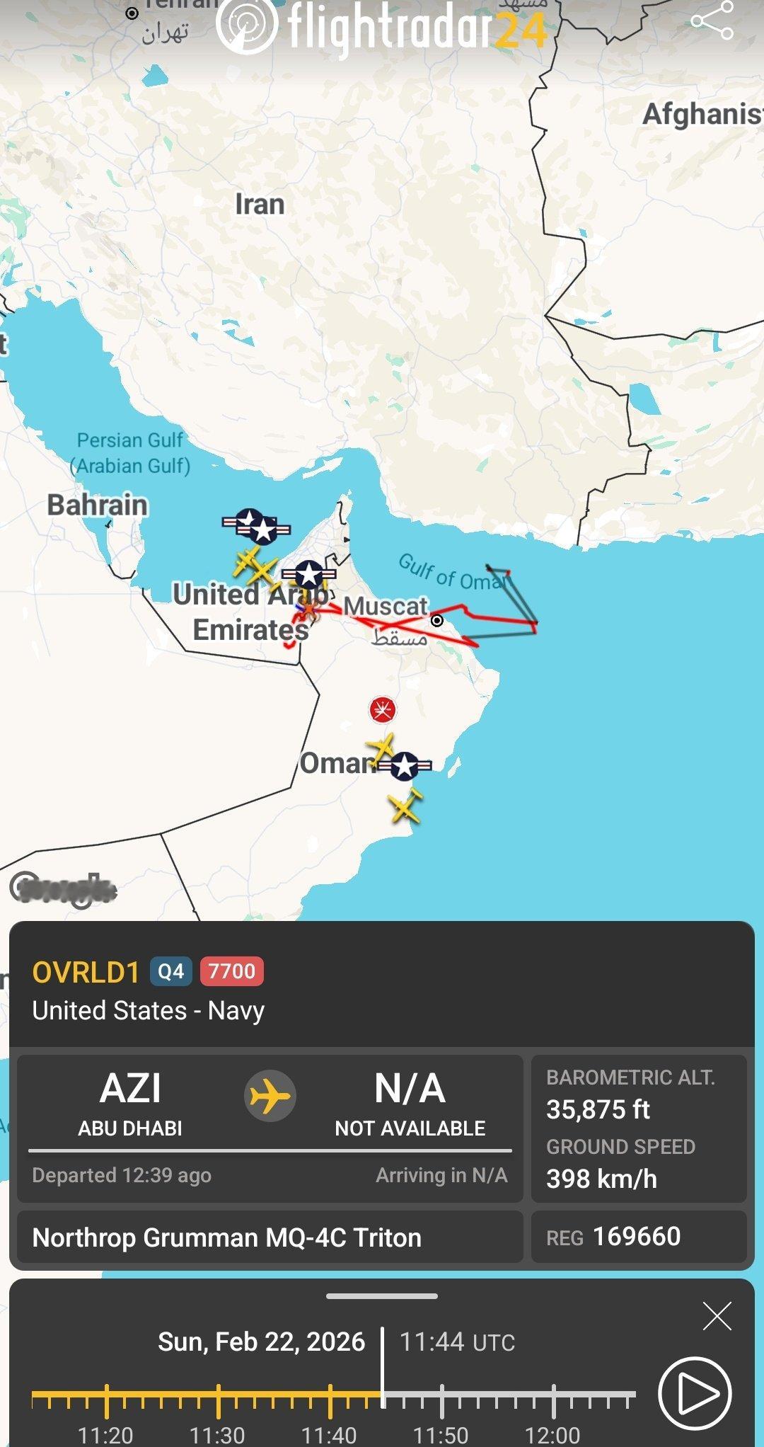 🔻F24数据显示:2 架 C-17A 运输机从乌代德空军基地飞往迪戈加西亚岛。🔻数小时前,来自关岛的一批疑似轰炸机(很可能为 B52)在加油机的拖曳下飞抵迪戈加西亚。🔻值得注意的是,昨日该地区仅剩的一架美军 MQ-4C"海神"侦察机(编号 169660)执行完伊朗海岸附近任务返航时突发技术故障,紧急发送了 7700 遇险代码。美考虑初步打击伊朗海外新鲜事热点现场国际局势