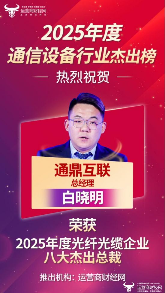 通鼎互联总经理白晓明凭借过去一年的出色表现,成功入选“2025年度光纤光缆企业八大杰出总裁”。