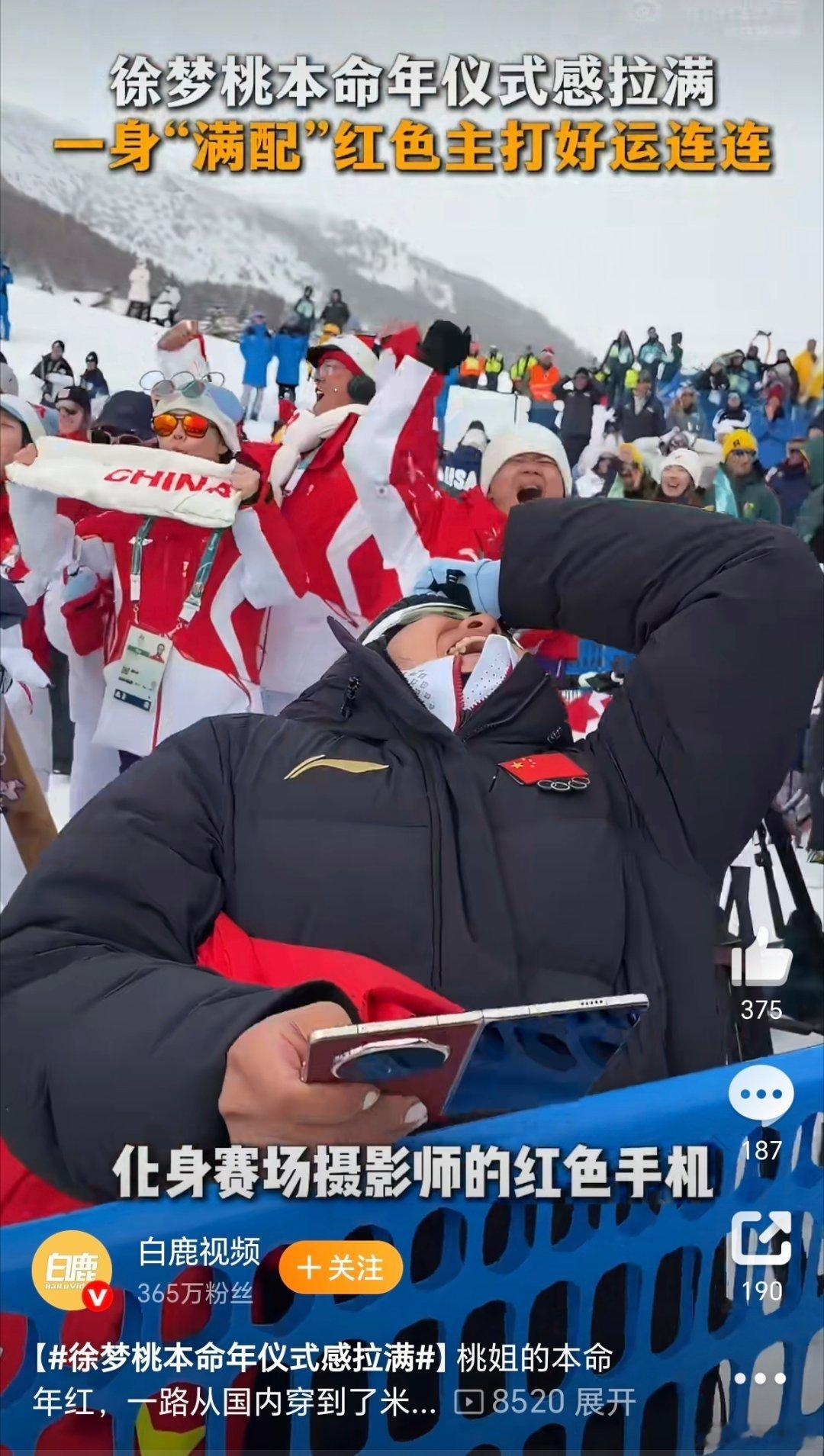 红色外套、红色保温杯、红色挂件、红色围巾手套,当然最亮眼的无疑是她在赛场拍照的红色手机,这是赤马红,用徐梦桃的话说,它就像战马一样,寓意着马到成功。