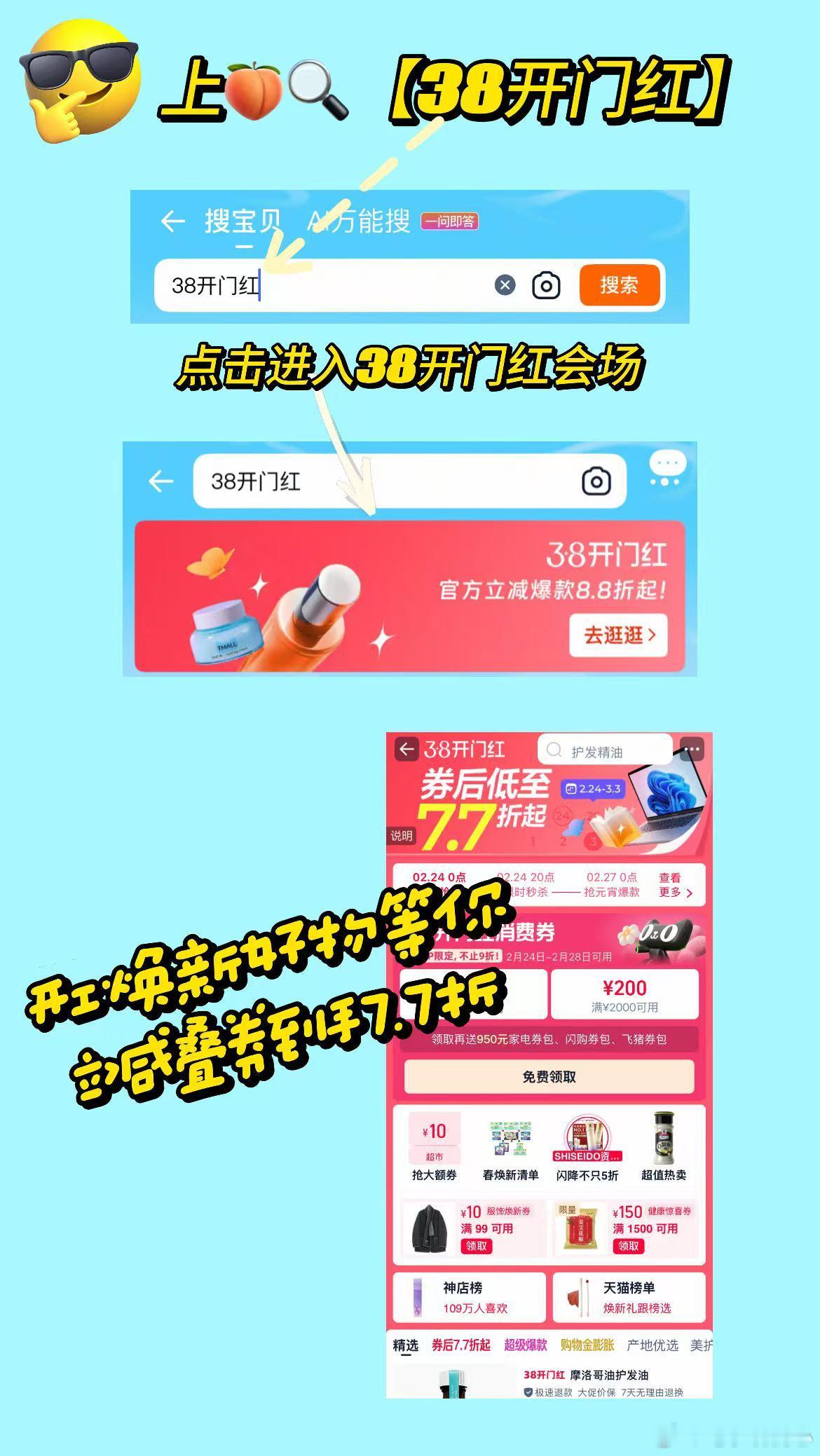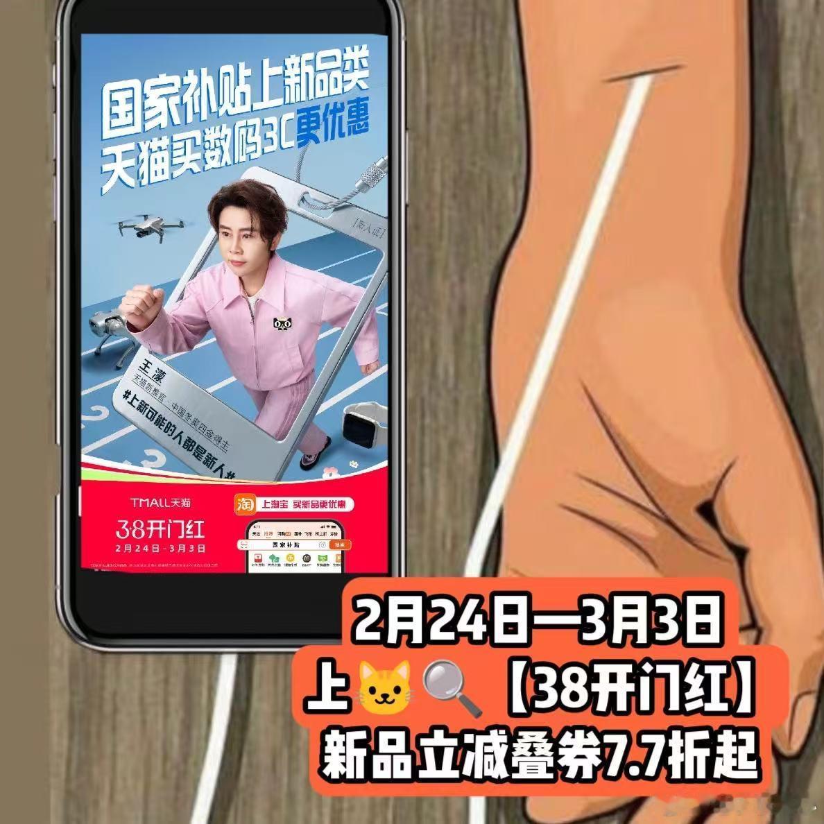 天猫38迎新而上开工新头好全都上淘宝开年第一波大优惠来啦!2月24日-3月3日,上淘宝🔍【38开门红】,新品立减叠券7.7折起,好物多多折扣够香,开工就要新头好!