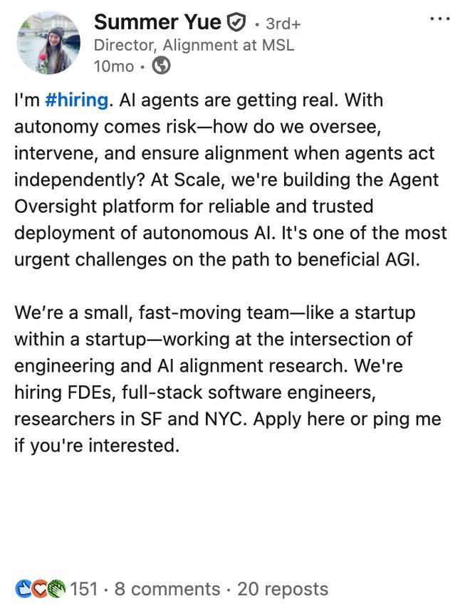 还有人翻出Yue的LinkedIn,截图发推:「这位是MetaAI安全和对齐总监。这应该让你感到恐惧。」