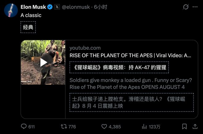 他转发了一段《猩球崛起》的病毒视频——士兵把一把上了膛的AK-47递给猴子。