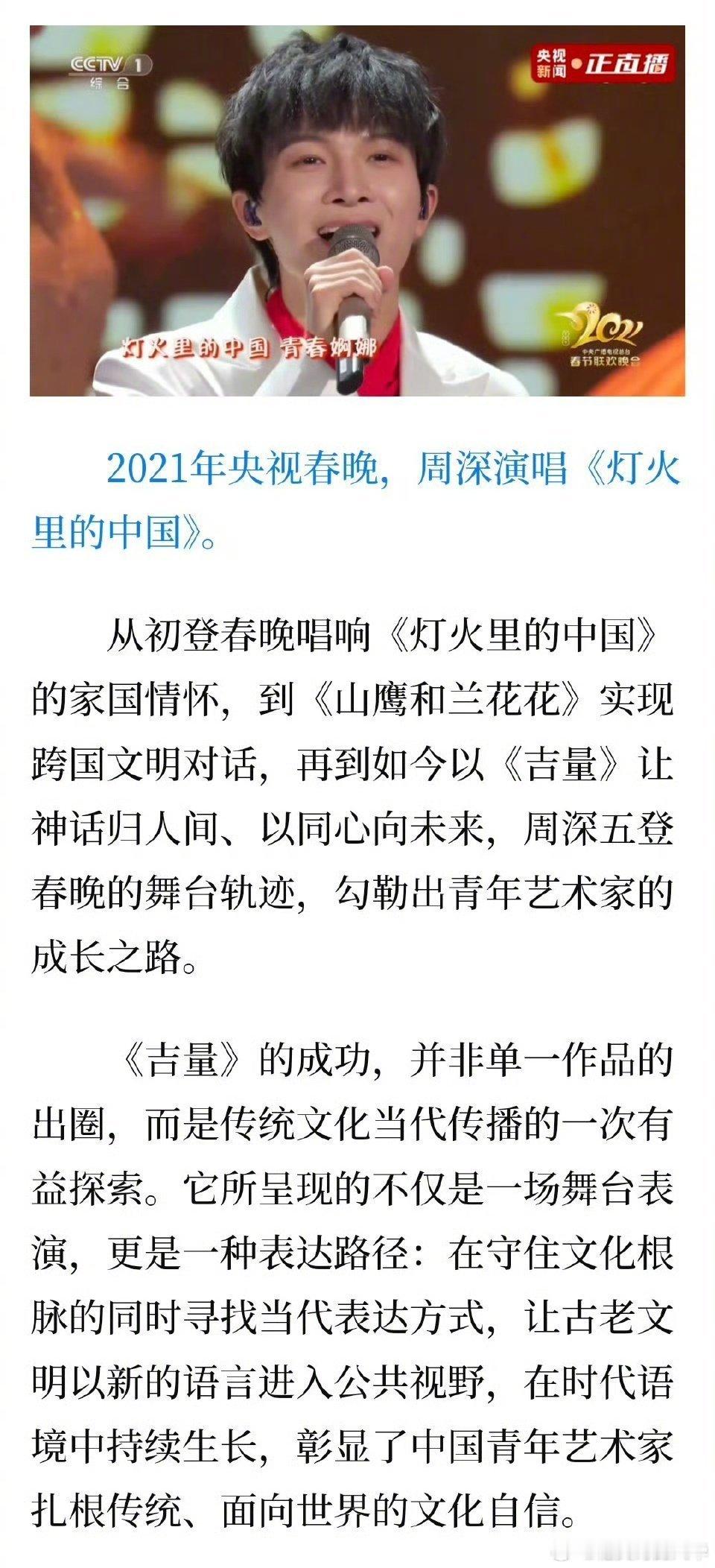 周深六年五次登上春晚舞台媒体复盘周深五登春晚 实力铸就传奇,周深再获盛赞!六年五次登台,三次独唱高光。新华社点评其轨迹,《吉量》文化价值远超舞台本身。