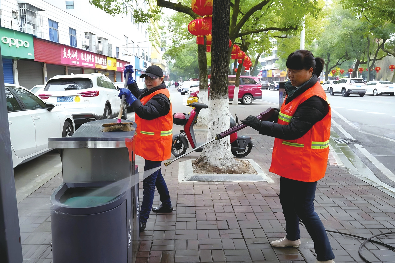 环卫工人仔细清理道路果皮箱。李胜利摄