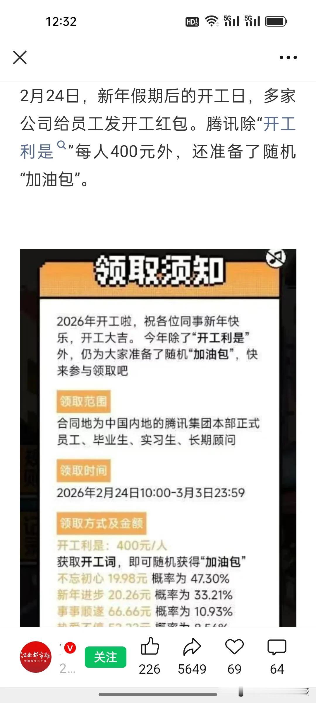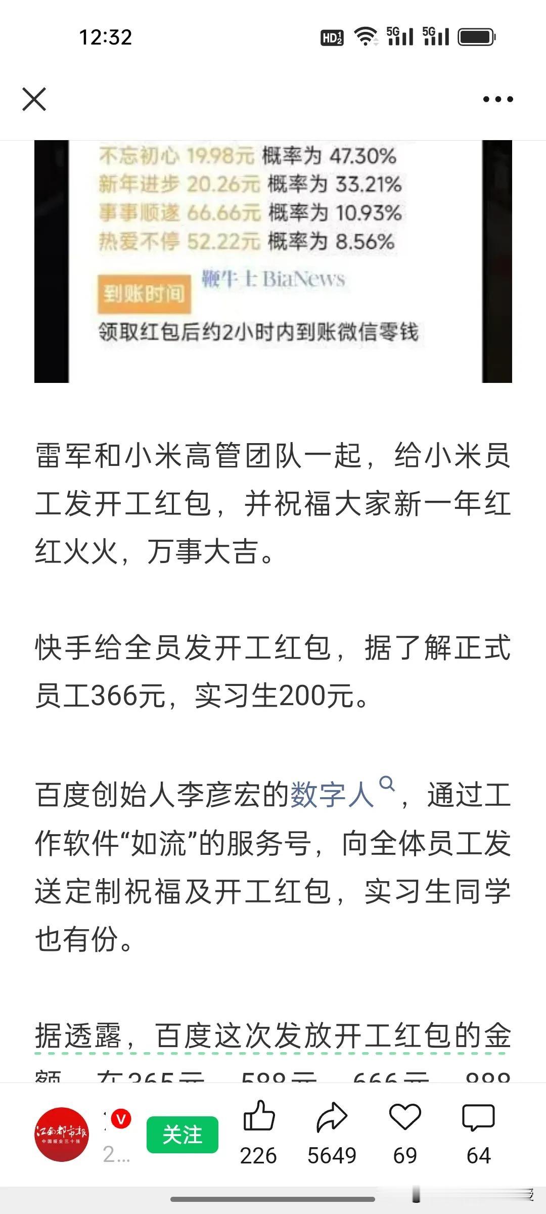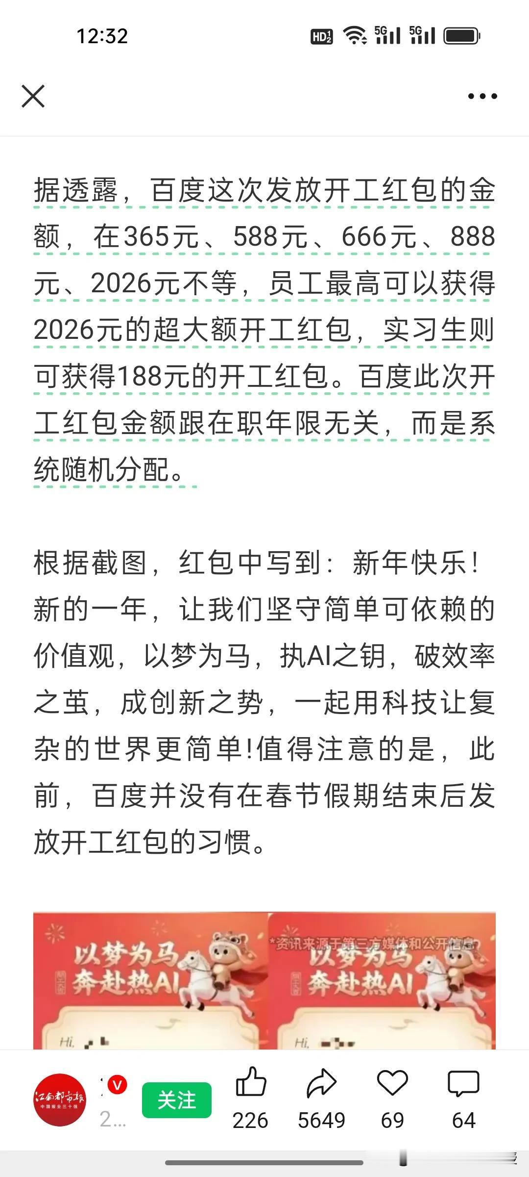 今天大年初八开工第一天,百度发红包赢了!这是百度首次发开工红包,最高2026元,这预示着今年百度要一举突围了? 大年初八开工,互联网大厂红包大战打响:腾讯400元+随机加油包,小米雷军亲自发,快手366元,而百度直接炸场——首次发开工红包,最高竟达2026元,实习生也有188元,金额随机不看工龄。 作为首次发开工红包的大厂,百度这次手笔远超同行,从365元到2026元的梯度,藏着对AI时代的野心。红包里“执AI之钥,破效率之茧”的寄语,更像是吹响冲锋号。 这波操作,是单纯福利,还是要在AI赛道搞大动作?毕竟,百度沉默了太久,今年如此舍得砸钱的公司,从来都不缺野心。