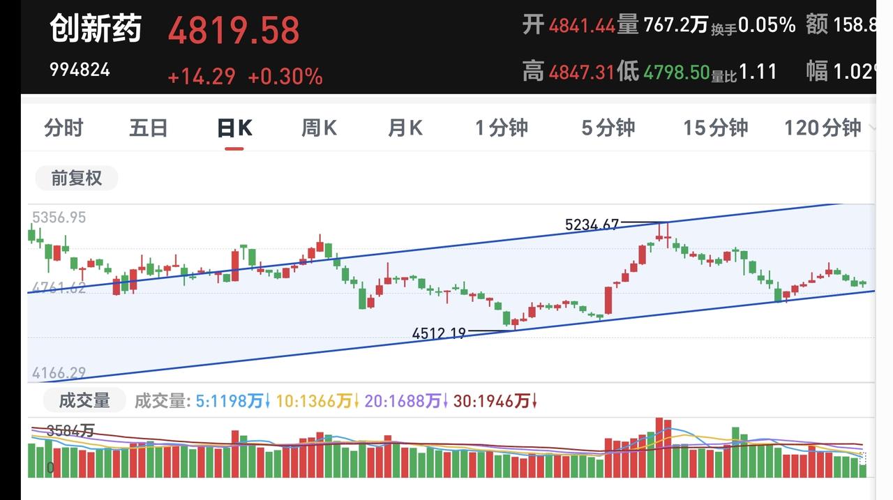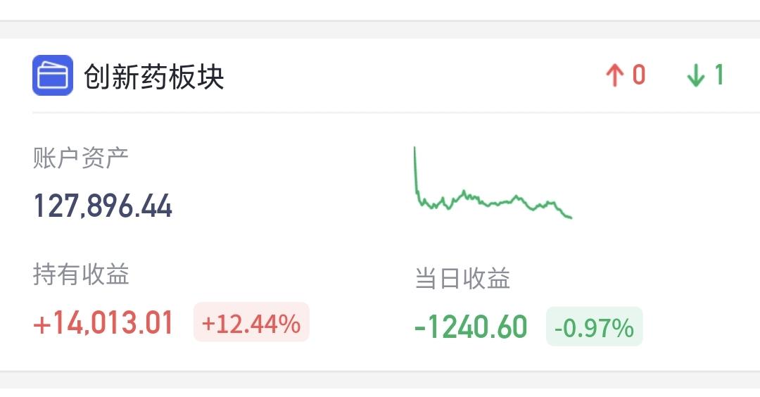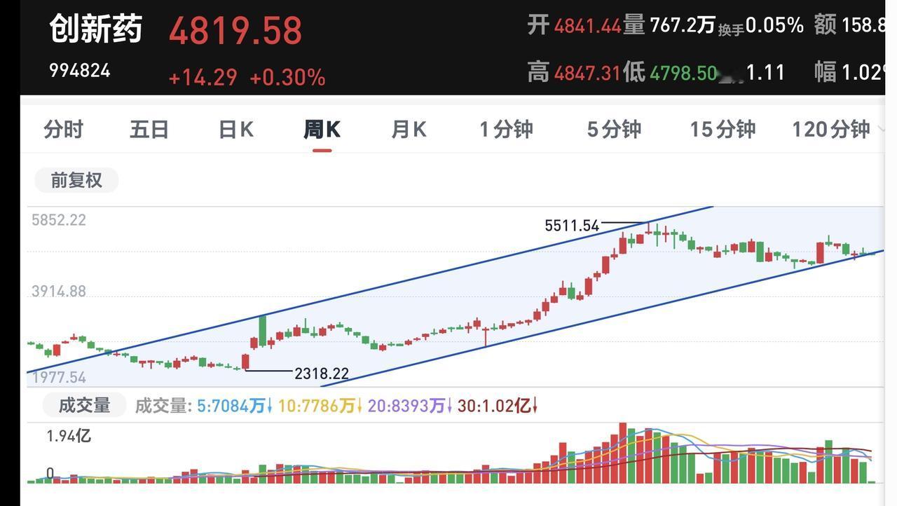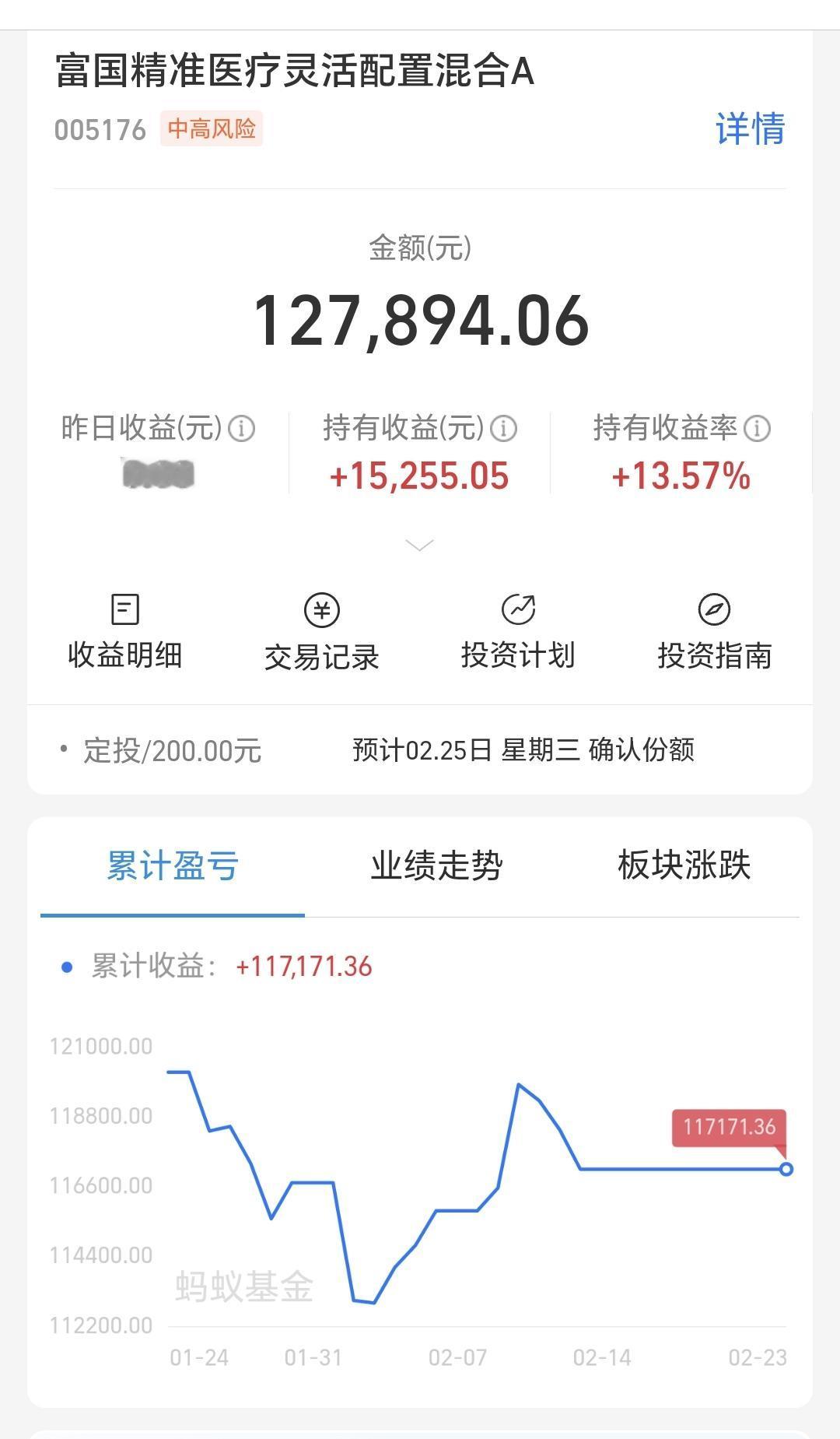 基金:创新药板块应该怎么办 创新药板块今天是下跌的,盘中估值下跌了1.13%,是连续第四个交易日下跌,持有人数在所有板块当中排名第18位。 创新药板块日线级别处于上涨通道中,距离上涨通道的下轨线很近,这个地方可以继续持有,前期高位止盈了的人也可以选择捞回止盈的筹码。 创新药板块周线级别也是处于上涨通道中,现在的位置就处在上涨通道的下轨线附近,这里是长线持有者可以考虑的进场点。 我持有的创新药板块基金富国,盘中估值下跌了0.97%,持有金额127894元,持有收益15255元,持有收益率13.57%,累计收益117171元,每天定投200块钱。 这只基金我把定投额度从10块钱调整为200块钱,就是对前期止盈筹码的回补,这与许多人的想法是不一样的,很多人想在最高点止盈出来,然后在最低点在全仓进去,这是一种理想化的操作方式,如果以定投的方式进行,能够增加筹码捞取的稳定性,当然,前提是我对当今市场的判断,我认为现在的市场大环境还是处于震荡过程当中,市场的短期方向还没有选择向上。 玩基金需要有耐心,进场的时间并不是某一天,进场的时间是某一段,进场的点也不是那个最低点,进场的点是某一个相对的低位区域,创新药板块是这样的,其他的板块也是这样的。 今天下午大幅度上涨的可能性不大,但跳水大幅度下跌的可能性也很小,只要黄色线能够保持在蓝色线上方,只要成交量不会大幅度萎缩,春节以后第一个交易日的下午,就是一个横盘震荡走势,春节以后的第一个交易日,就是一个开门红走势,春节之前最后一个交易日没有拿到红包的人,今天大部分人都能收到一个不大不小的红包,祝大家2026年投资顺利!祝大家2026年每一天都能够拿到红包,我今天到中午收盘的时候拿到了3895元的红包,你今天到现在为止已经拿到了多少钱的红包?红包不在于大小,而在于持续性,持续性的红包比一个大红包更重要,但愿我们每一个人都能够持续性拿到红包。