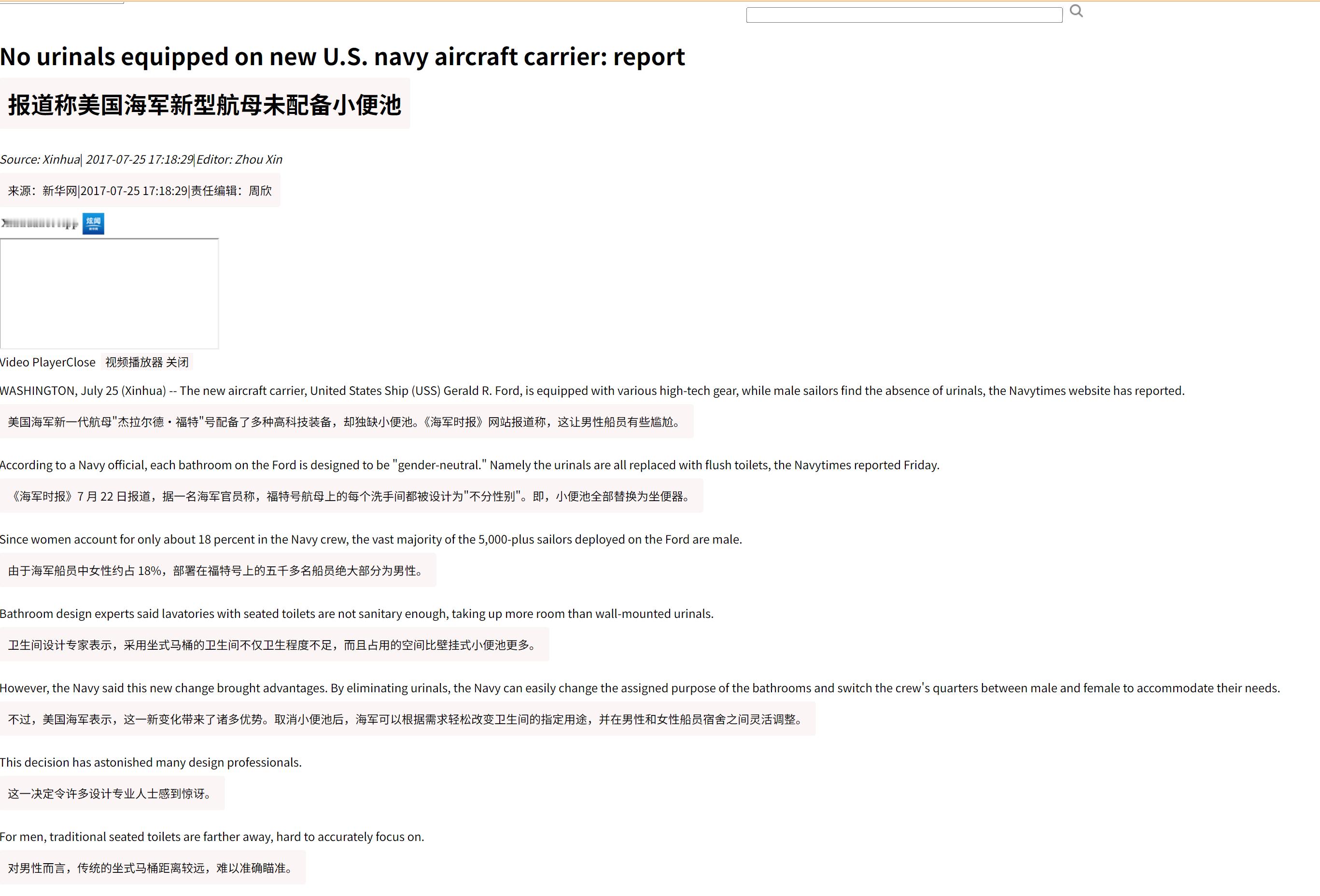 🔻说到福特号厕所的问题,我想起新华网2017年报道过的一则旧闻:🔻“报道称美国海军新型航母福特号上的每个洗手间都被设计为‘不分性别’。即,小便池全部替换为坐便器。未配备小便池。”🔻怪不得不够用呢。就算没坏也不够用啊。美福特号航母厕所大面积瘫痪海外新鲜事热点现场国际局势