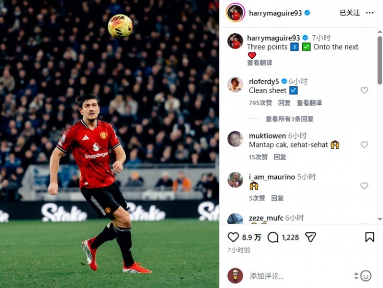 马奎尔在Instagram晒图并写道:“三分到手,目光投向下一场比赛。”