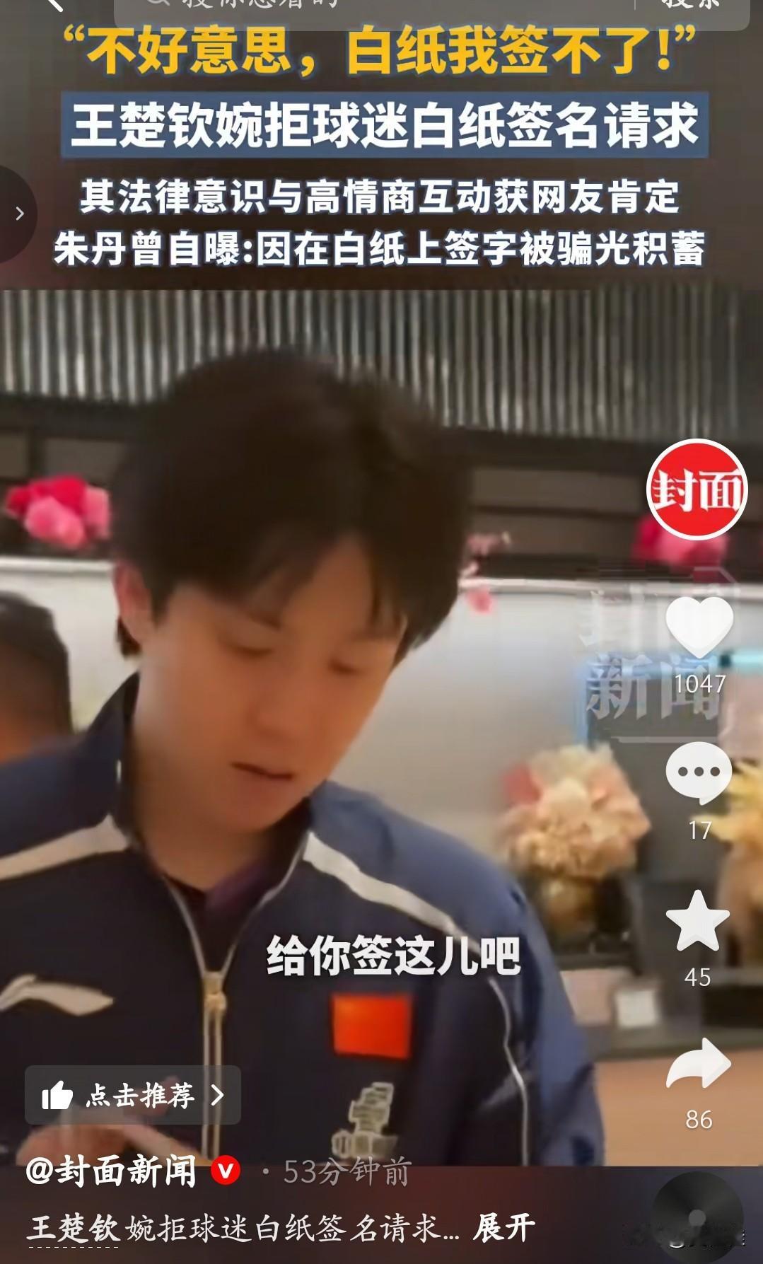 这个事,必须给王楚钦一个大大的赞! 面对球迷递来的白纸,他没有直接生硬拒绝,而是礼貌又坚定地说:“不好意思,白纸我签不了。”然后主动提出:“给你签这儿吧。”既守住了自己的底线,又照顾到了对方的感受,情商和分寸感都拉满。 白纸签名这事看着小,其实风险不小。之前就有不少人因为在白纸上签字,被别有用心的人钻了空子,最后惹上麻烦。王楚钦能有这样的法律意识和自我保护意识,真的很难得。 他没有因为自己是公众人物就放松警惕,也没有因为要满足粉丝的期待就妥协。这种清醒、稳重又有边界感的态度,比赛场上的成绩更让人佩服。 从这件小事就能看出来,他不仅是球场上的好运动员,更是生活里有原则、有智慧的成年人。这样的王楚钦,值得大家喜欢和尊重。