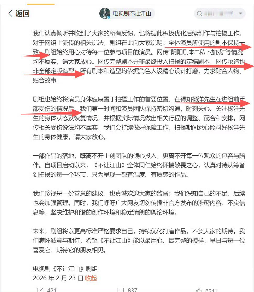 律师称不让江山未定稿不能成免责盾牌关于《不让江山》的剧本争议,剧组早就辟谣啦,只有一版剧本,大家理性吃瓜,别被假消息误导哦